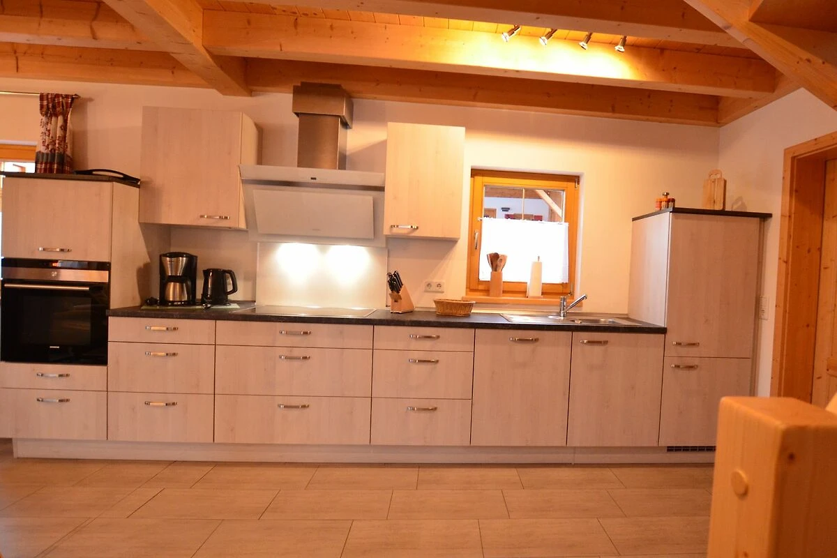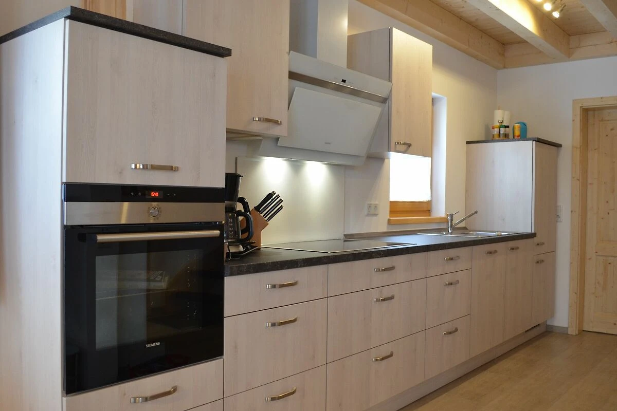 Begrüßt werden Sie von der hochwertigen, modernen und offenen Küche mit Kühl-Gefrierkombination, Mikrowelle, Kaffeemaschine, Backofen, Spülmaschine, Wasserkocher und Toaster.