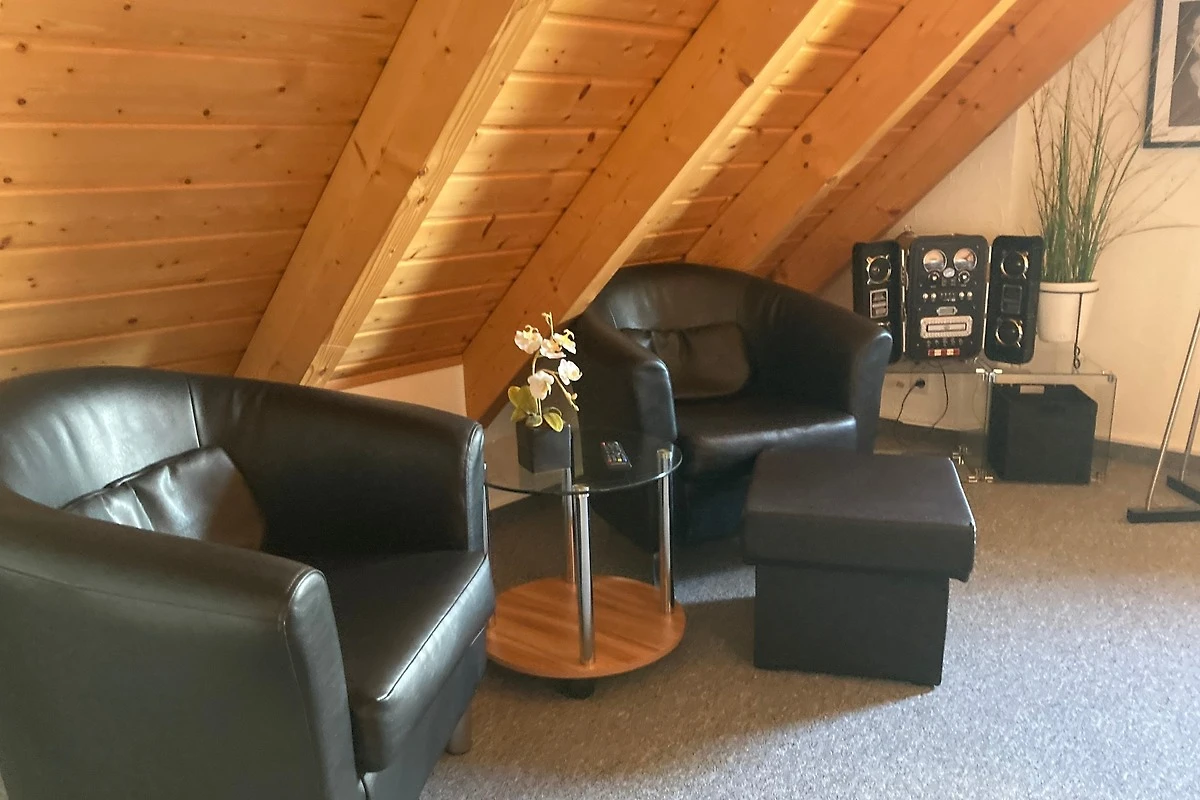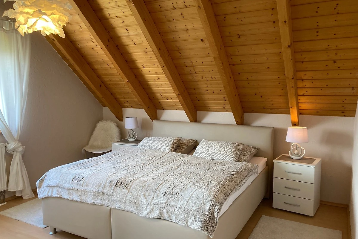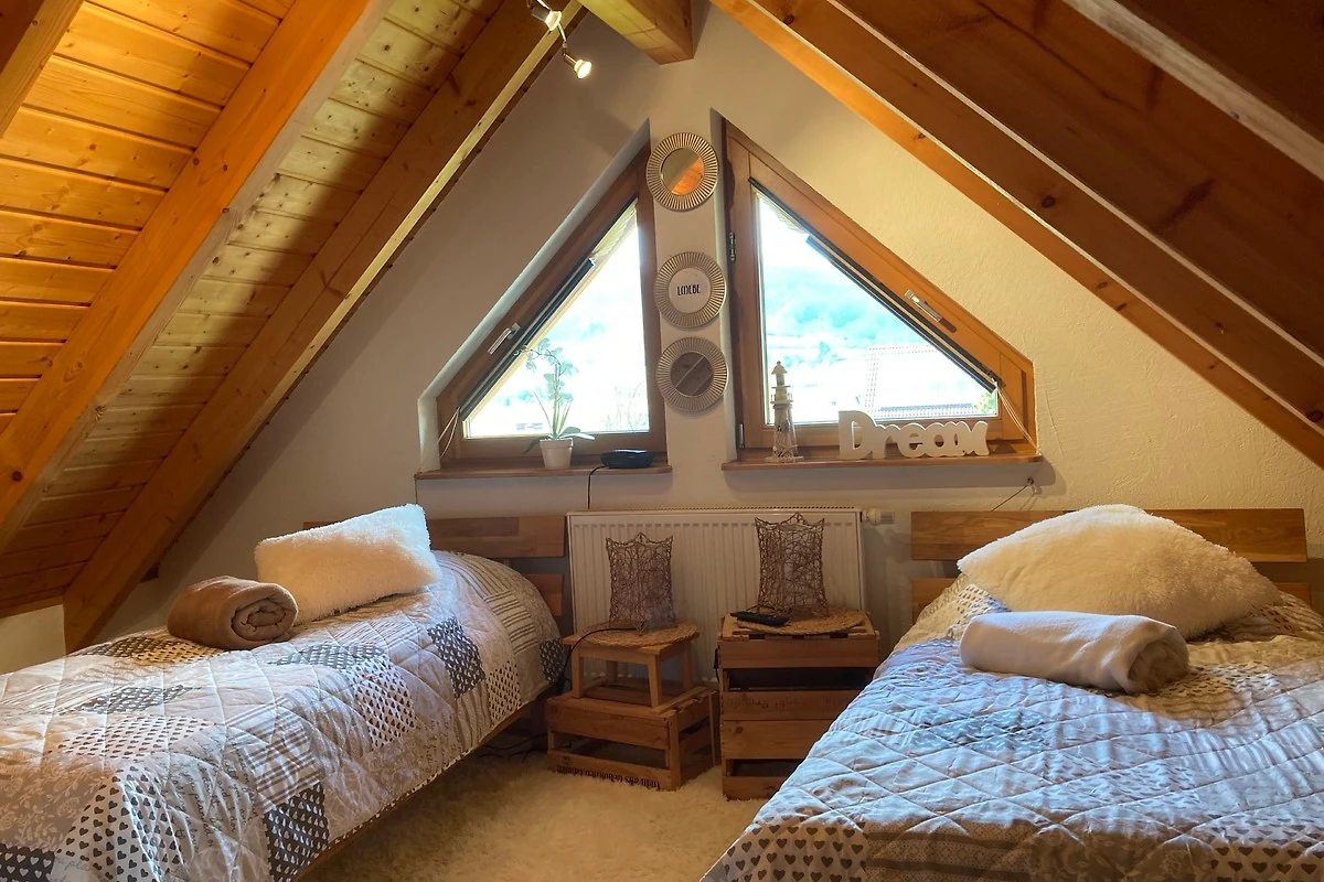 Im offenen Schlafraum mit Spitzboden und Dreieckfenstern befinden sich zwei auseinander stehende Betten a 1m x 2m. Diese können bei Bedarf auch gerne zusammen geschoben werden. Zur Ausstattung gehört ein Fernseher in fullHD Qualität und ein Radiowecker.
