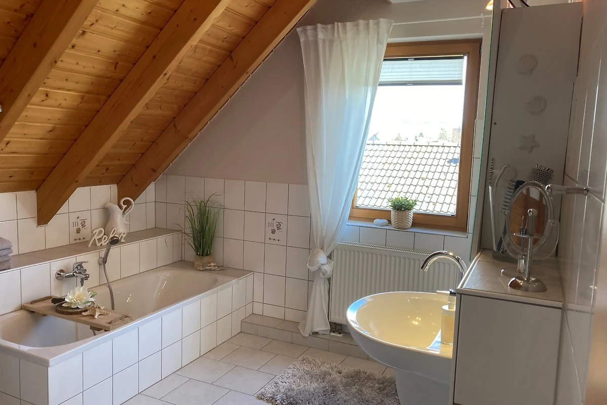 Das helle, freundliche Badezimmer lädt zu einer erfrischenden Dusche oder einem wohltuenden Bad ein. Handtücher, Duschtücher, Shampoo, Duschgel, Styling Utensilien, Kosmetikspiegel und Fön sind vorhanden.
