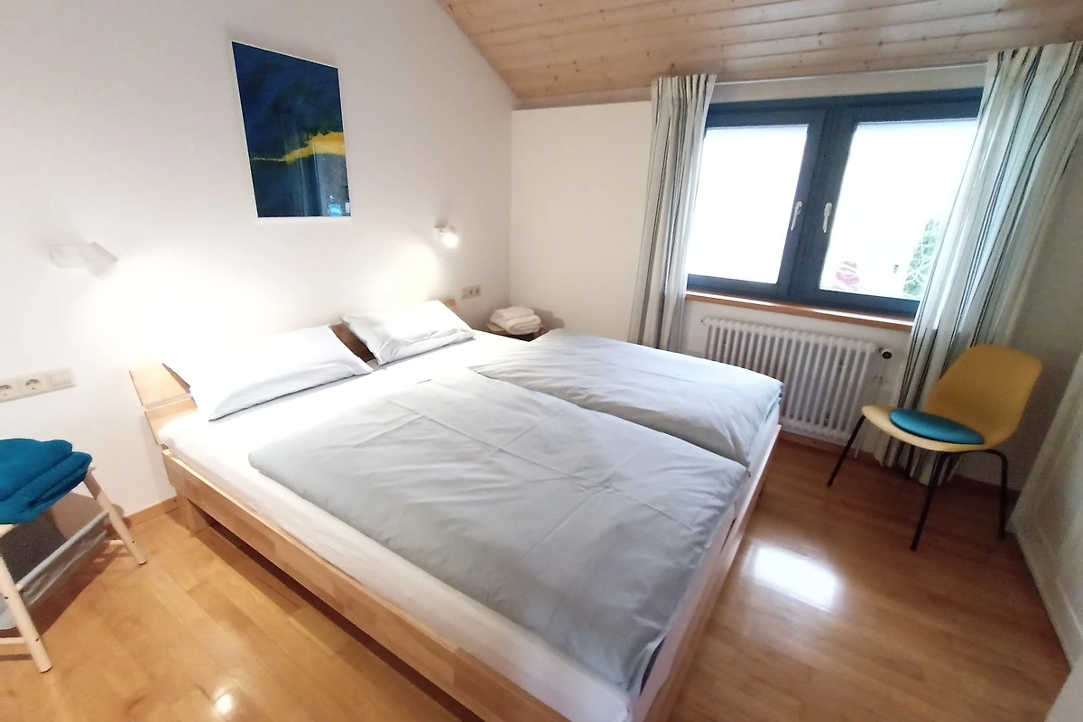 Die Ferienwohnung 2 im HAUS AM SEEPARK ist zur Abendsonne ausgerichtet und verfügt über zwei separate Schlafzimmer - eines ausgestattet mit Doppelbett und im zweiten mit zwei Einzelbetten, die zum Doppelbett gestellt werden können. Sie können uns nach Buchung angeben, wie wir die Betten für Ihren Aufenthalt stellen sollen.