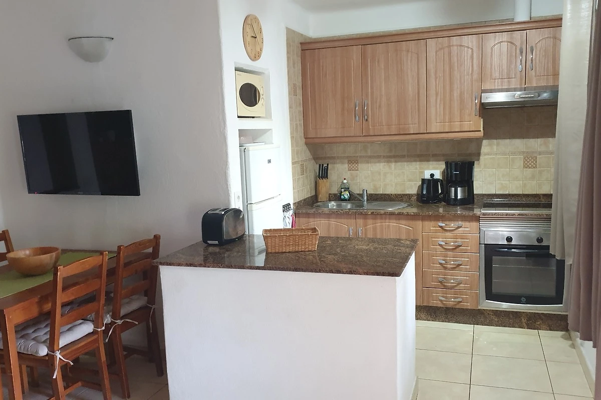 Die offene Küche enthält ein Cerankochfeld, Backofen, Mikrowelle, Kühl-Gefrierschrank, Toaster, Wasserkocher und Kaffeemaschine. Die Waschmaschine befindet sich hinter der Tür auf der Terrasse. Bügeleisen und Bügelbrett sind ebenfalls vorhanden.