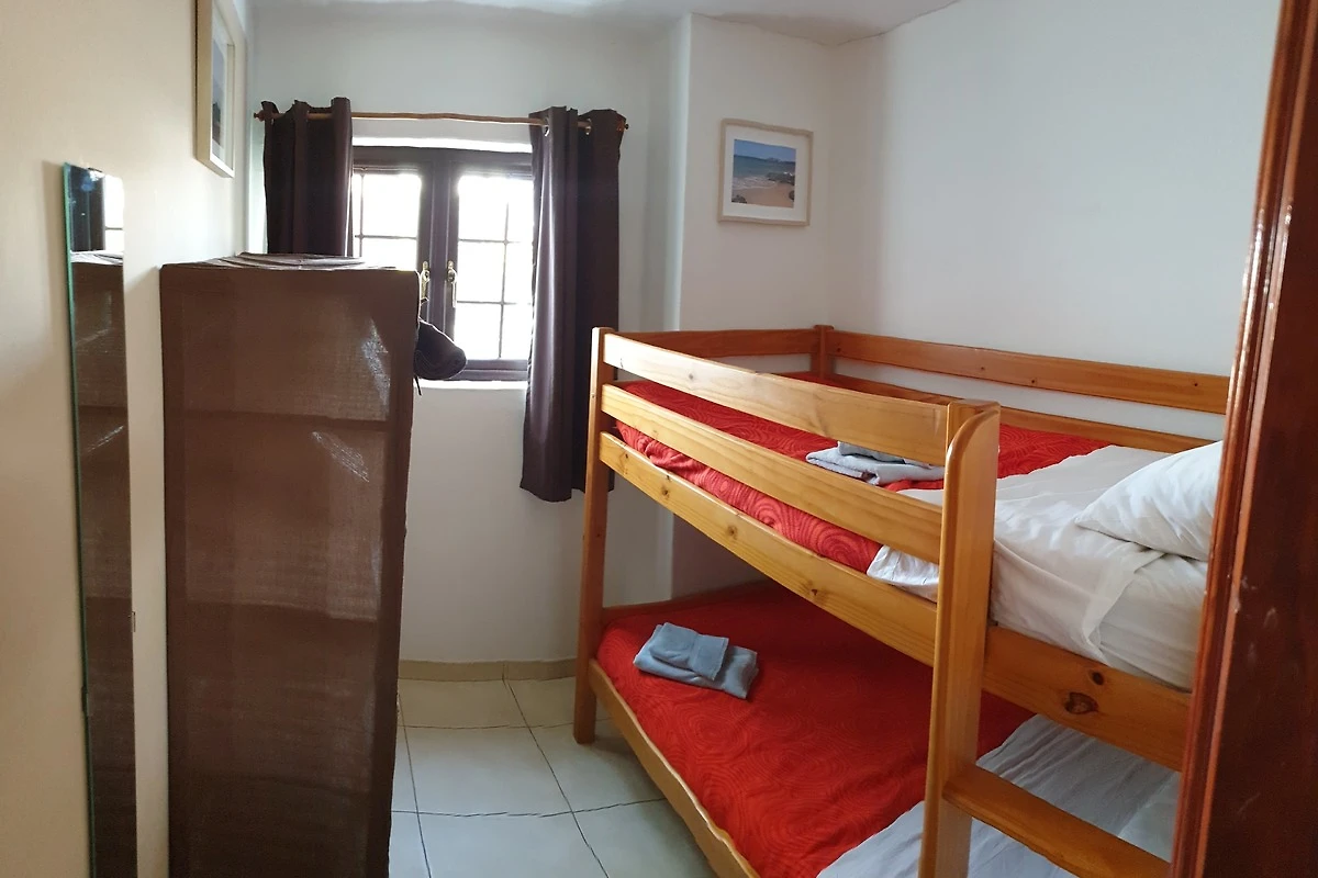 Das erste Schlafzimmer bietet zwei Einzelbetten, einen Einbauschrank und einen Schminktisch. Das kleine Schlafzimmer verfügt über ein Etagenbett und einem Regalschrank.