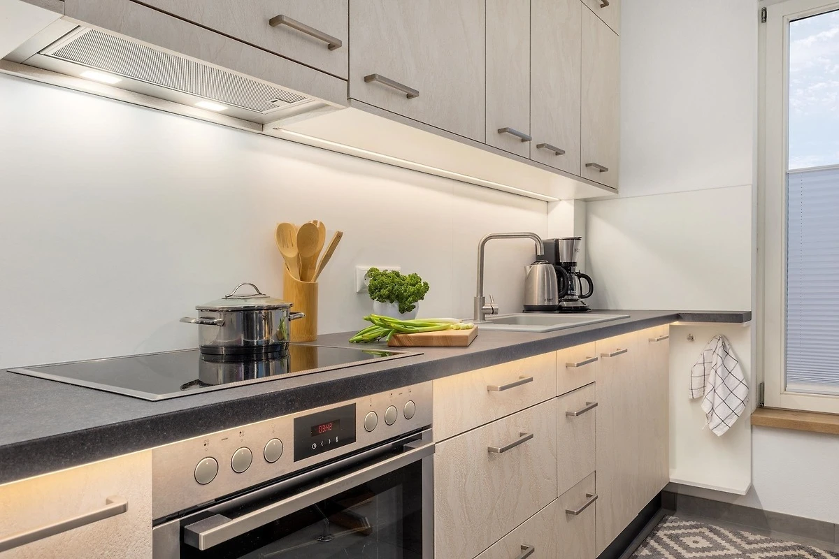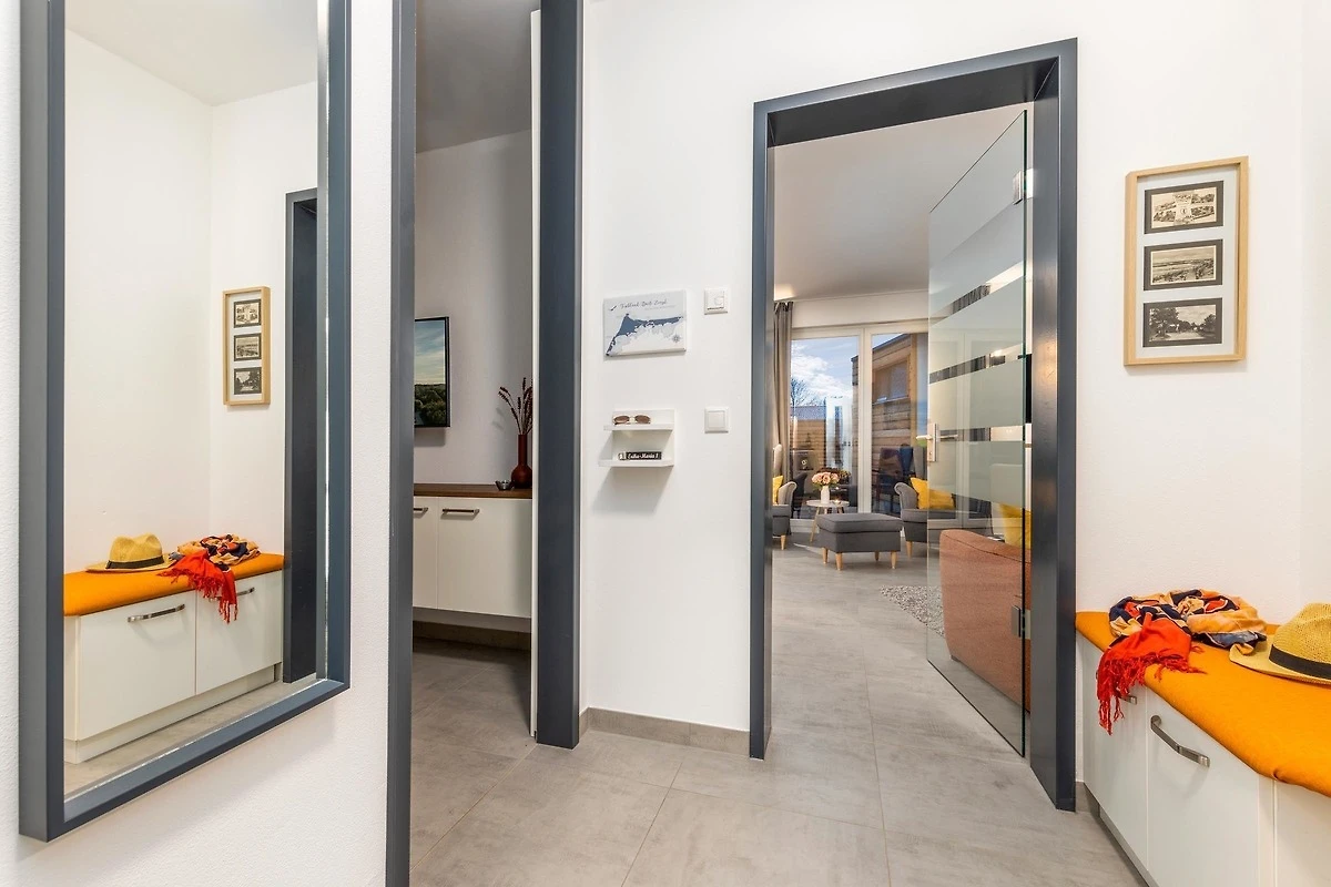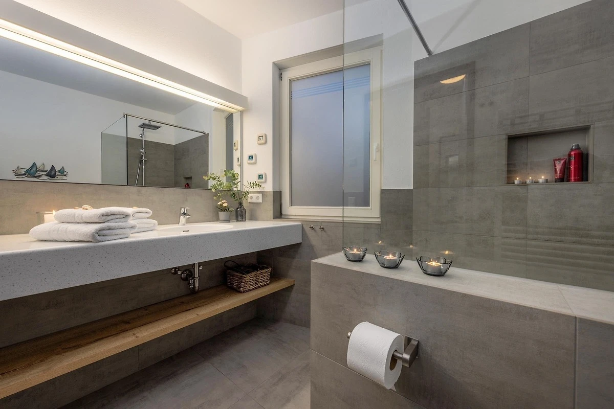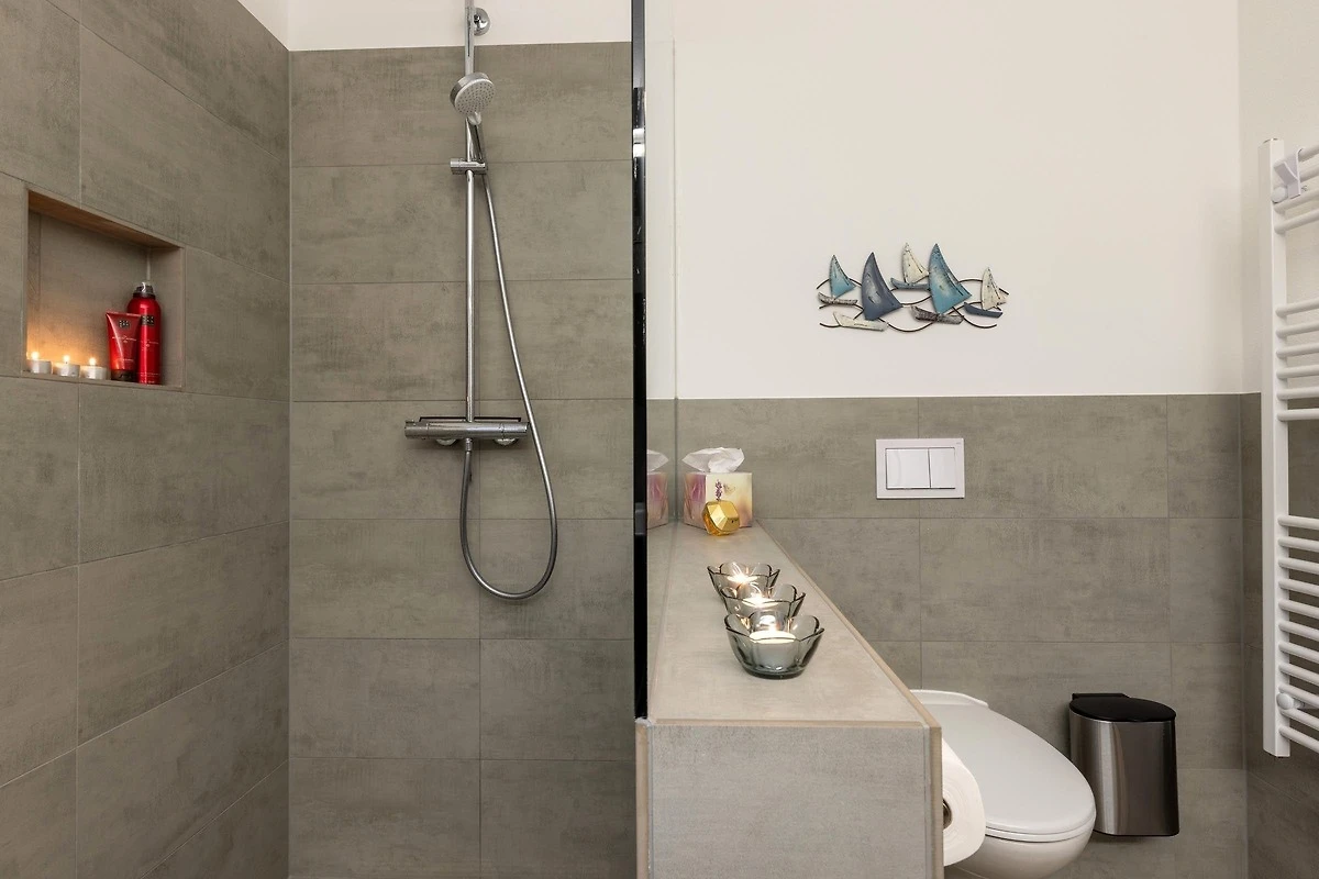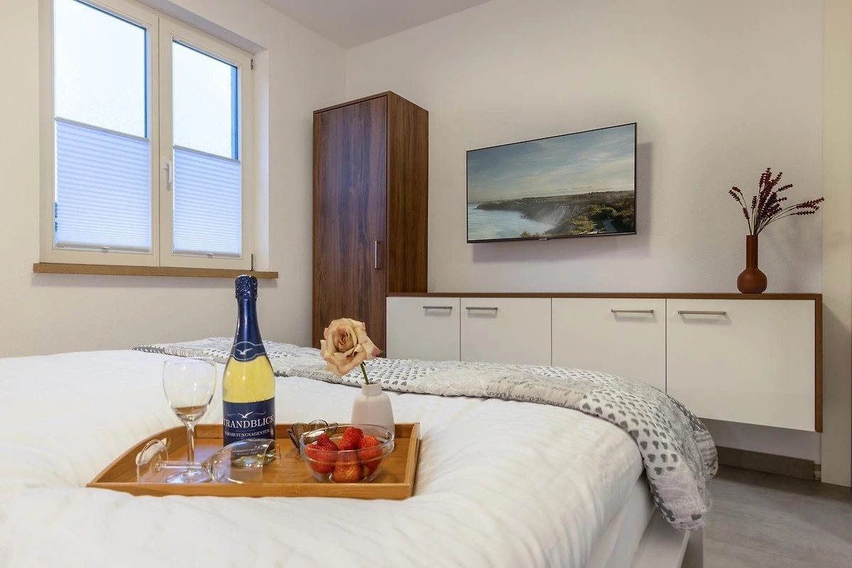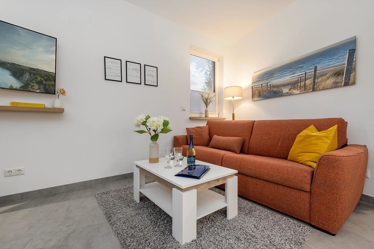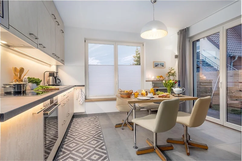 In dieser stilvollen Ferienwohnung erwartet die Gäste ein hoher Komfort in einem modernen Design. Der offene Wohnbereich lädt zum Entspannen ein und ist mit einem Sofa, einer Schlafcouch und einem Esstisch ausgestattet. Die offene Küche glänzt mit modernen Geräten, darunter ein Geschirrspüler, Elektro-/Gasherd, Backofen, Mikrowelle und Kühlschrank. Für Kaffeeliebhaber steht eine Kaffeemaschine bereit.