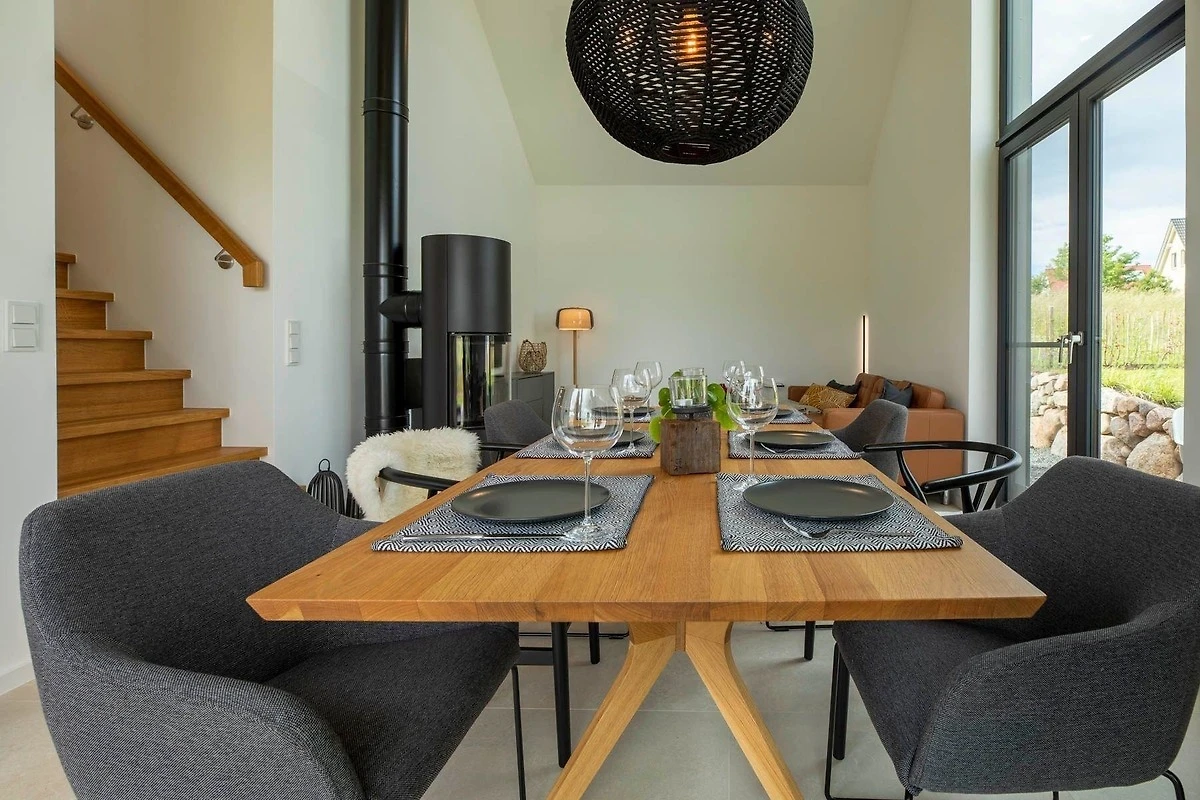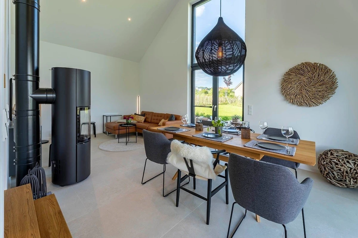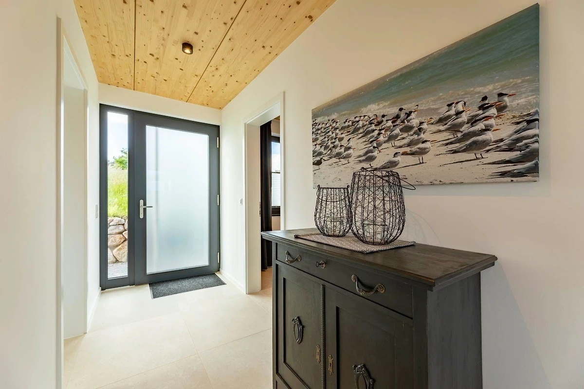 Das Ferienhaus "Strandgänger Hohwacht" bietet auf etwa 110 Quadratmetern Platz für bis zu 6 Personen und zeichnet sich durch seine moderne Ausstattung aus. Im Erdgeschoss befinden sich ein ebenerdiges Schlafzimmer mit Doppelbett und zwei stilvolle Badezimmer, die mit bodentiefen Duschen und modernen Armaturen ausgestattet sind. Eine geräumige Küche mit hochwertiger Ausstattung, darunter ein Induktionskochfeld, Spülmaschine und grosser Kühlschrank, lädt zum Kochen ein. Der helle Wohnbereich mit Kamin schafft eine einladende Atmosphäre. Im Obergeschoss befinden sich zwei weitere Schlafzimmer, eines mit Doppelbett und eines mit einem Einzelbett, das sich in ein Doppelbett umwandeln lässt. Die Sauna, die an das grössere Badezimmer angrenzt, bietet zusätzlichen Komfort. WLAN und Glasfaseranschluss sind ebenfalls verfügbar. Ein Haustier ist auf Anfrage gestattet. Gemeinschaftliche Nutzung von Waschmaschine und Trockner im Hauswirtschaftsraum.