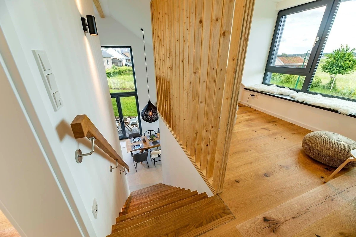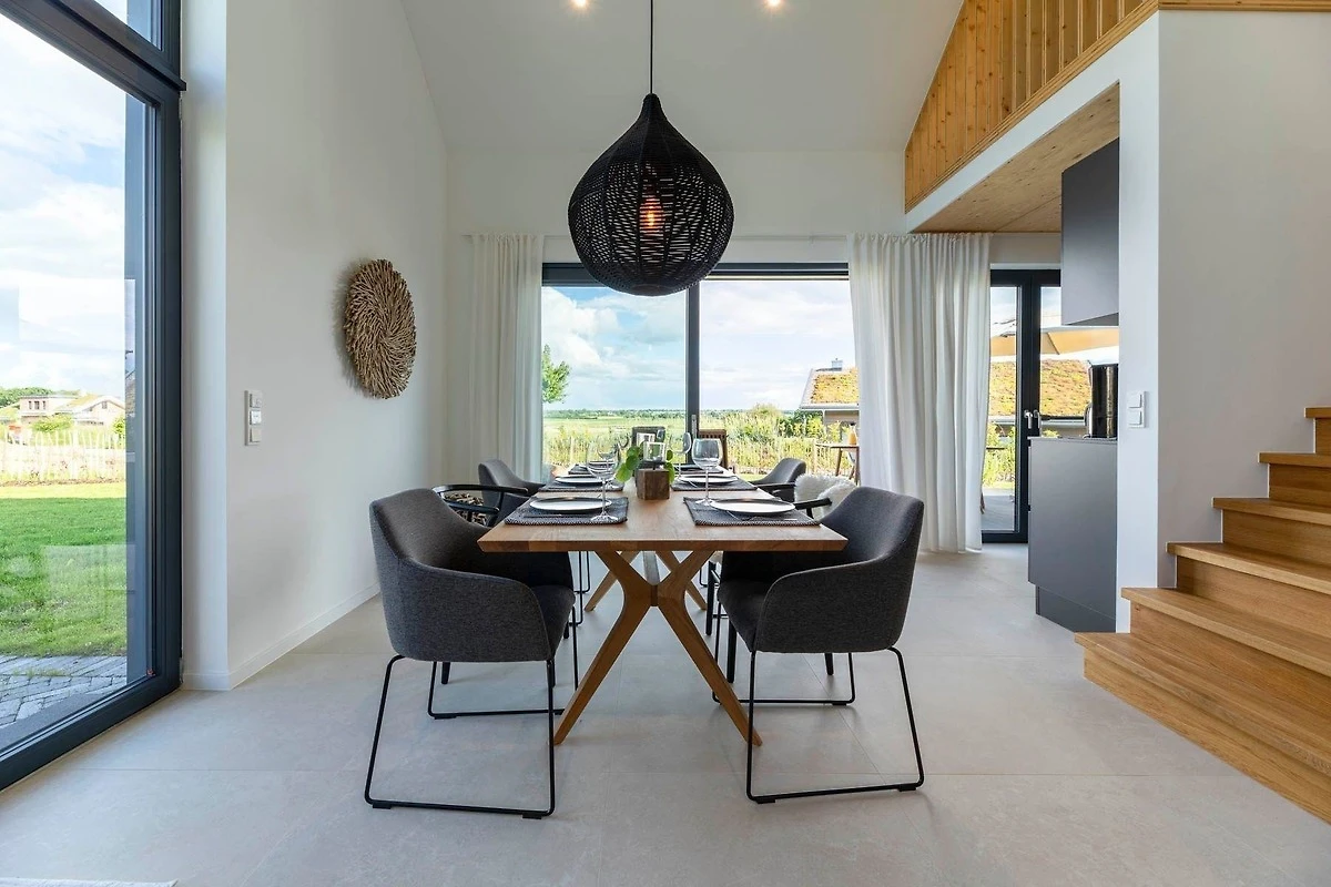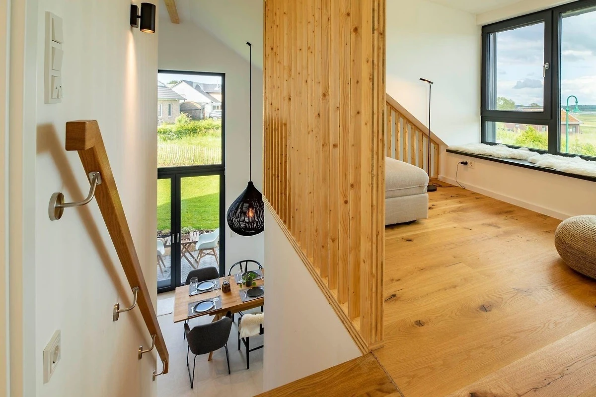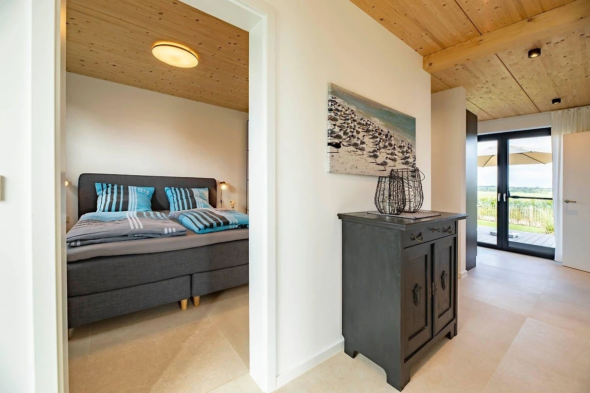 Das Ferienhaus "Strandgänger Hohwacht" bietet auf etwa 110 Quadratmetern Platz für bis zu 6 Personen und zeichnet sich durch seine moderne Ausstattung aus. Im Erdgeschoss befinden sich ein ebenerdiges Schlafzimmer mit Doppelbett und zwei stilvolle Badezimmer, die mit bodentiefen Duschen und modernen Armaturen ausgestattet sind. Eine geräumige Küche mit hochwertiger Ausstattung, darunter ein Induktionskochfeld, Spülmaschine und grosser Kühlschrank, lädt zum Kochen ein. Der helle Wohnbereich mit Kamin schafft eine einladende Atmosphäre. Im Obergeschoss befinden sich zwei weitere Schlafzimmer, eines mit Doppelbett und eines mit einem Einzelbett, das sich in ein Doppelbett umwandeln lässt. Die Sauna, die an das grössere Badezimmer angrenzt, bietet zusätzlichen Komfort. WLAN und Glasfaseranschluss sind ebenfalls verfügbar. Ein Haustier ist auf Anfrage gestattet. Gemeinschaftliche Nutzung von Waschmaschine und Trockner im Hauswirtschaftsraum.