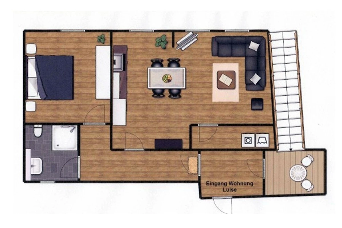 Für eine gelungene Auszeit steht Ihnen ein grosszügiger Wohn- und Essbereich mit funktionaler Küchenzeile bereit. Ein bequemes Sofa und TV ist im offenen Wohnkonzept perfekt integriert. Für einen hohen Schlafkomfort sorgt das gemütliches Schlafzimmer mit Doppelbett sowie ein Bad mit extra flacher Duschwanne. Hier werden sich Gross und Klein wie zuhause fühlen.