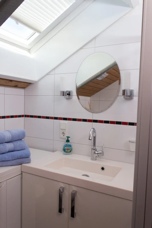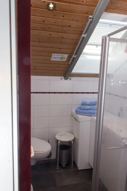 Das neue, ebenerdige Duschbad mit Fussbodenheizung und Handtuchwärmer bietet höchsten Komfort. Es ist mit einem grosszügigen Waschtisch, einer modernen Dusche und hochwertigen Armaturen ausgestattet. Eine Waschmaschine und ein Trockner stehen Ihnen ebenfalls zur Verfügung und sorgen für zusätzlichen Komfort bei längeren Aufenthalten.