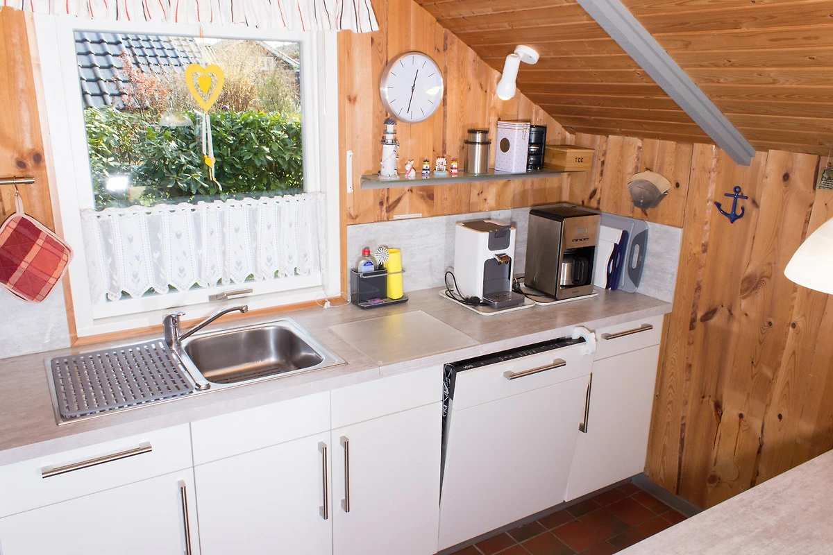 Unser Ferienhaus verfügt über eine Wohnfläche von rund 59m² und ist stilvoll sowie funktional eingerichtet. Die offene, voll ausgestattete Küche lässt mit Cerankochfeld, Backofen, Geschirrspüler, Mikrowelle, Kaffeemaschine, Wasserkocher, Toaster und umfangreichem Kochgeschirr keine Wünsche offen. Direkt angrenzend befindet sich der gemütliche Essbereich mit einem grossen Esstisch, an dem die ganze Familie Platz findet.