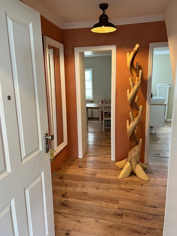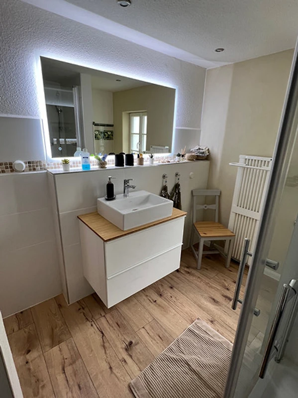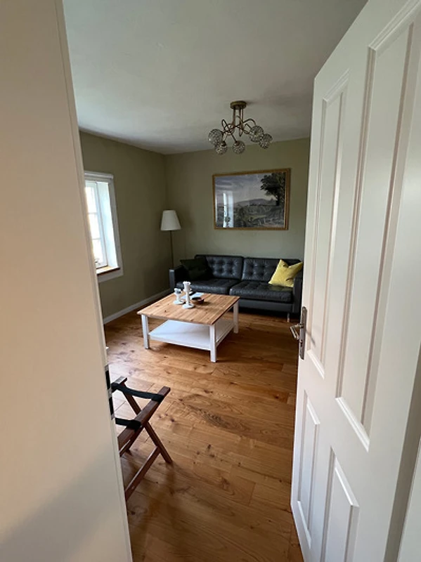 1 Wohnbereich (Sofa, Tisch, Kleiderschrank sowie Arbeitsplatz / Schreibtisch, TV mit TV-Magenta und zahlreichen anderen Programmdienstleistern, schnelles WLAN und die Möglichkeit eines LAN-Anschlusses). Der Wohnbereich verfügt - ebenso wie der Schlafbereich - über warme Kirschholzdielen.