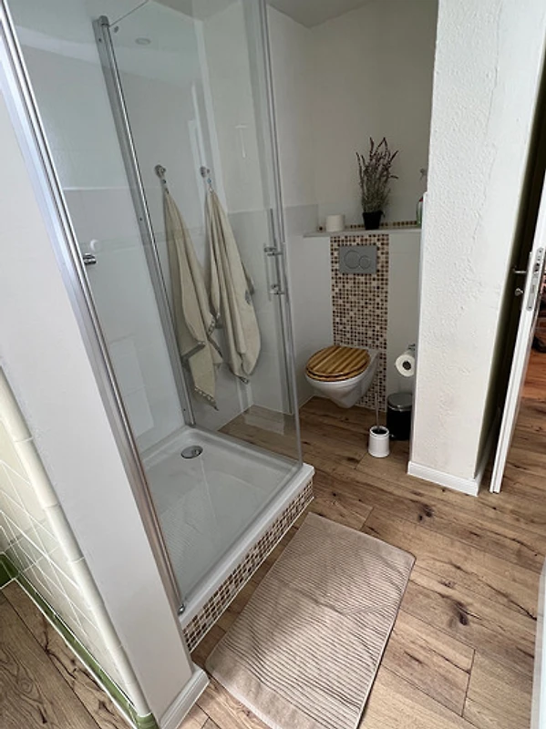 1 Bad mit WC, Urinal und Dusche (inkl. Hand- und Duschtücher, Seife). Der Bereich des Urinals ist mit alten Retro-Fliesen von Villeroy&Boch aus dem Jahr 1900 gefliest