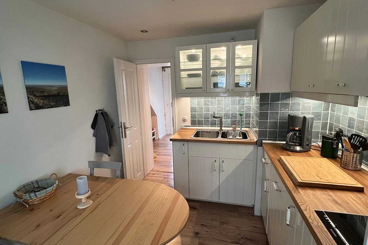 1 Küche (Induktionsherd, Backofen, Kühlschrank mit Gefrierfach, Kaffeemaschine für Filterkaffee, Toaster, Wasserkocher, Kaffeepulver, Kaffeesahne, Konfitüre, Salz, Pfeffer, Zucker, Essig und Olivenöl inkl. Geschirr, Besteck