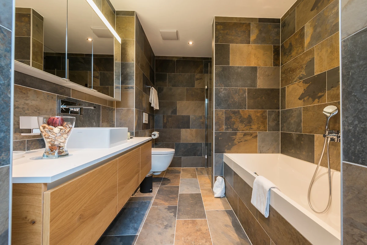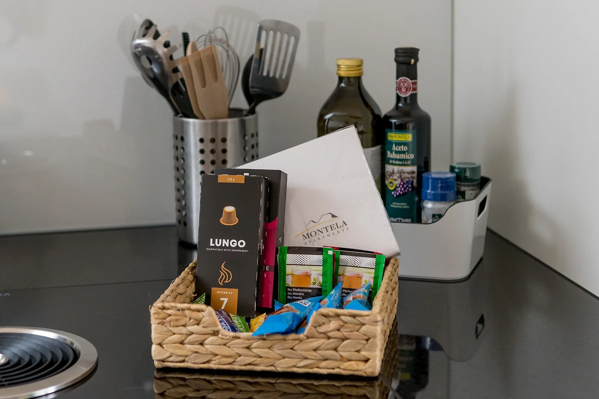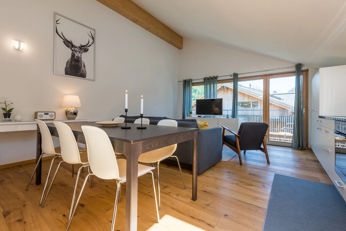 Die modernen Wohnungen sind geschmackvoll, gut und hell eingerichtet, sehr gute Ausstattung. Jeweils Kabel-Flat-TV (Apple-TV) und Radio. Die Küchen sind sehr gut und vollständig ausgestattet mit Einbauherd (4 Veranfelder), Backofen, Mikrowelle, Geschirrspüler, Kühl-/Gefrierkombination, Filter-Kaffeemaschine, Nespresso-Kapsel-Kaffeemaschine, Wasserkocher, Toaster, Fondue-Rechaud und Raclette-Gerät. Holzdielenböden im Wohnraum und Schlafzimmern mit Fussbodenheizung. Jedes Bad mit Haartrockner.