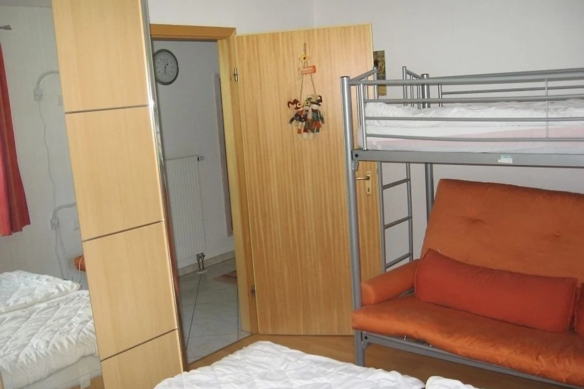 Schlafmöglichkeiten: 1 Schlafzimmer mit Doppelbett, 1 Schlafzimmer mit Doppelbett und Etagenbett, 2 Schrankbetten im Wohnzimmer, 1 Kinderbett