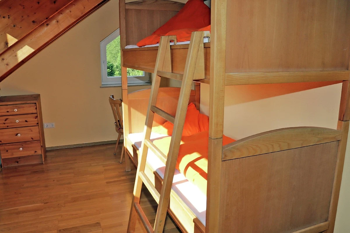 In der 1. Etage: (Schlafzimmer(Etagenbett), Schlafzimmer(Einzelbett, Einzelbett, Doppelbett), Badezimmer(Trockner, Badewanne mit Dusche, Waschbecken, Toilette, Waschmaschine), Terrasse, Kinderbett)