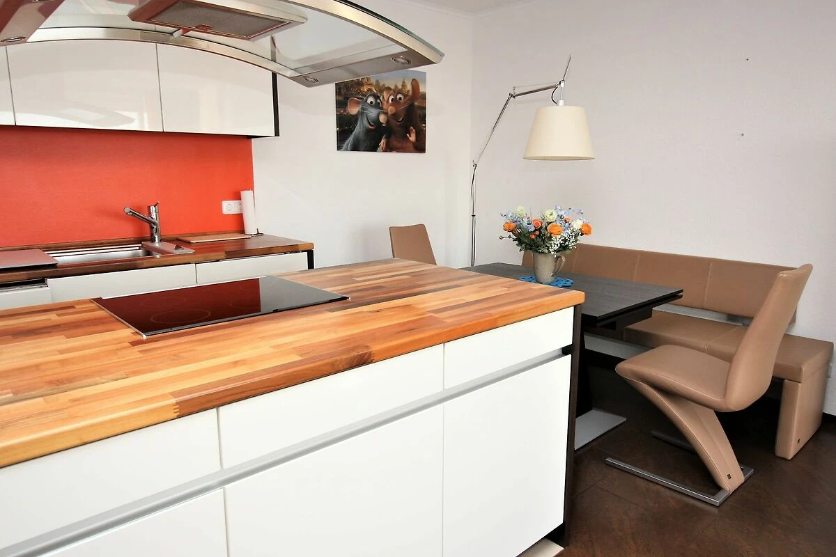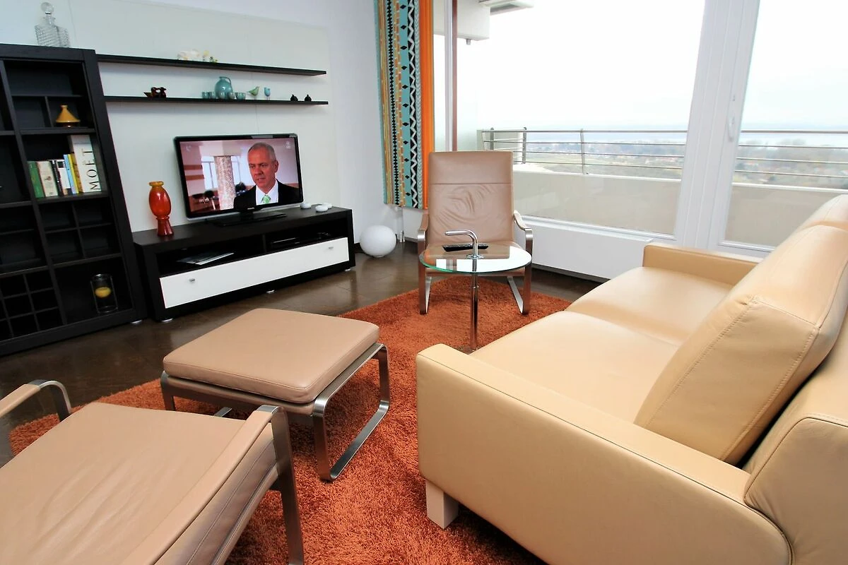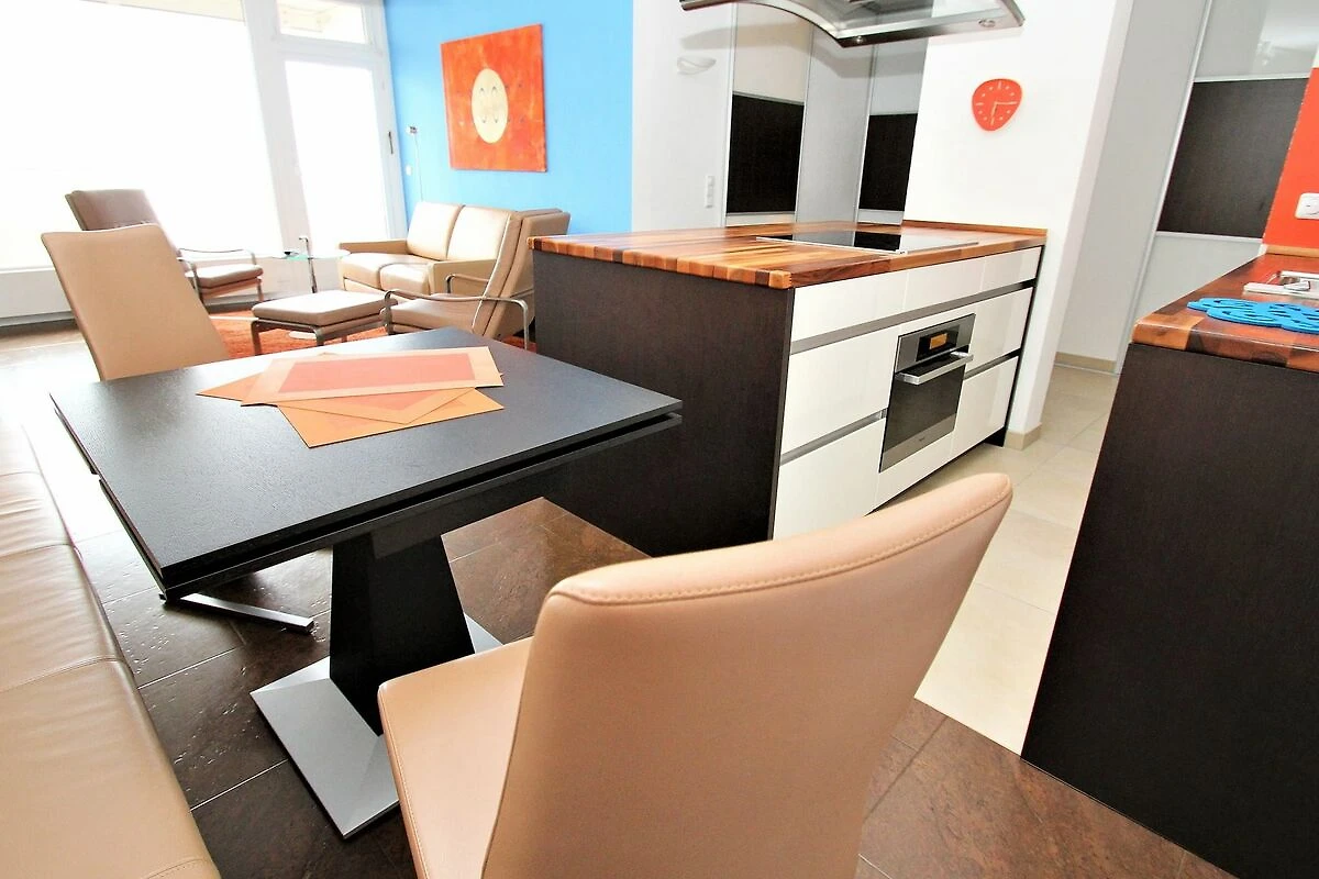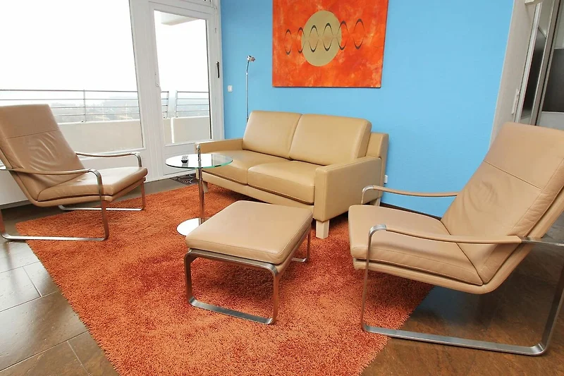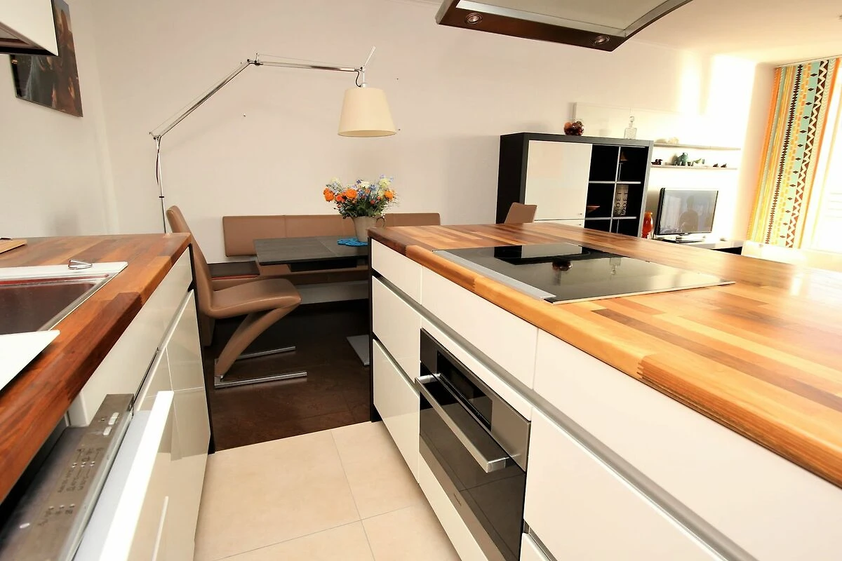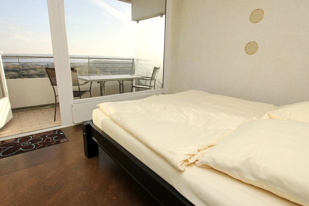In diesem einzigartigen Appartement, das nach der fernöstlichen Feng-Shui-Lehre eingerichtet ist, erwartet Sie eine sehr hochwertige Einrichtung. Die moderne Küche mit weissen Hochglanzfronten und Kochinsel ist harmonisch in den hellen Wohnraum integriert. An die Küche gliedert sich eine schöne Essgruppe an. Eine elegante Couch, zwei sehr bequeme Relax Sessel mit Fusshocker und ein Tisch, gegenüber der farblich abgestimmten Wohnwand, vermitteln entspanntes Wohlbefinden. Das Schlafzimmer ist mit einem komfortablen Doppelbett (2x 90 cm x 200 cm) sowie einem Kleiderschrank ausgestattet. Das luxuriöse Bad mit bodentiefer Duschkabine erreichen Sie vom Flur. Vom Wohn- und Schlafzimmer haben Sie einen Zugang zum Balkon. Hier geniessen Sie einen herrlichen Panoramablick direkt auf die Trave mit der Passat und lebhaftem Schiffsverkehr, zur Lübecker Bucht und zum Hafen.