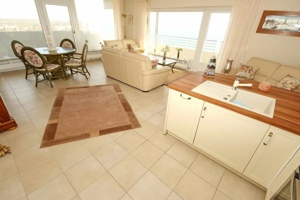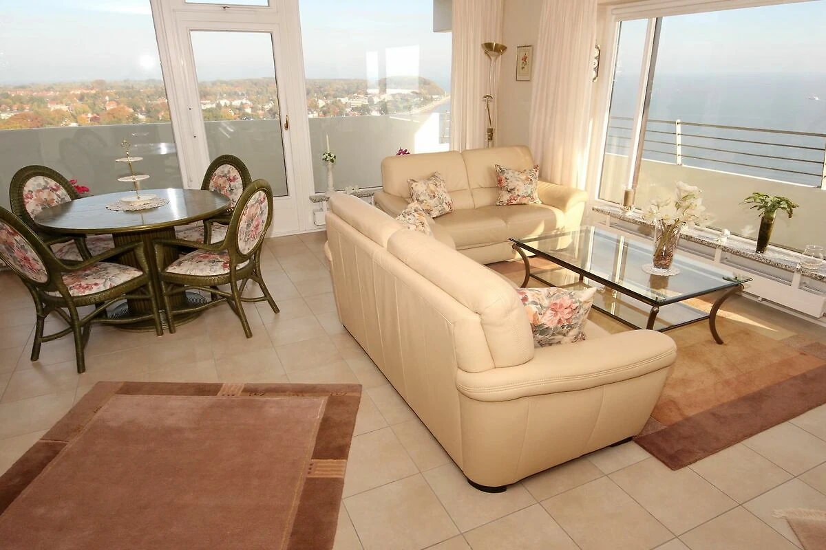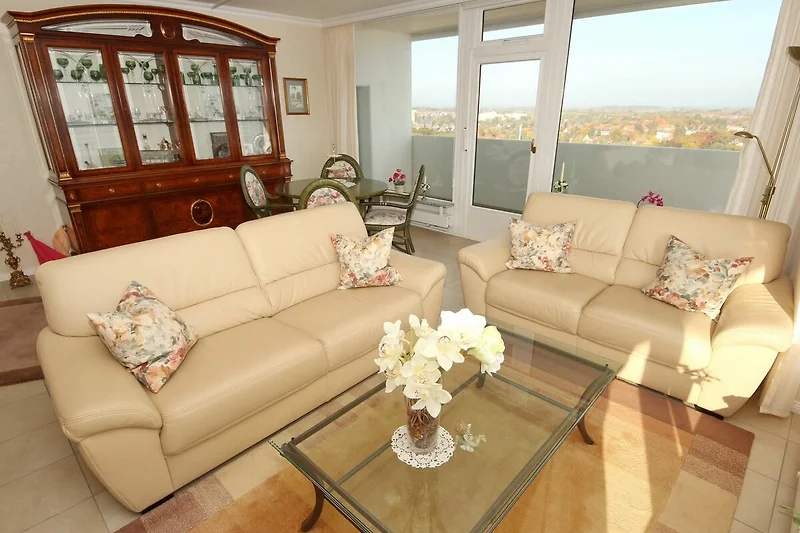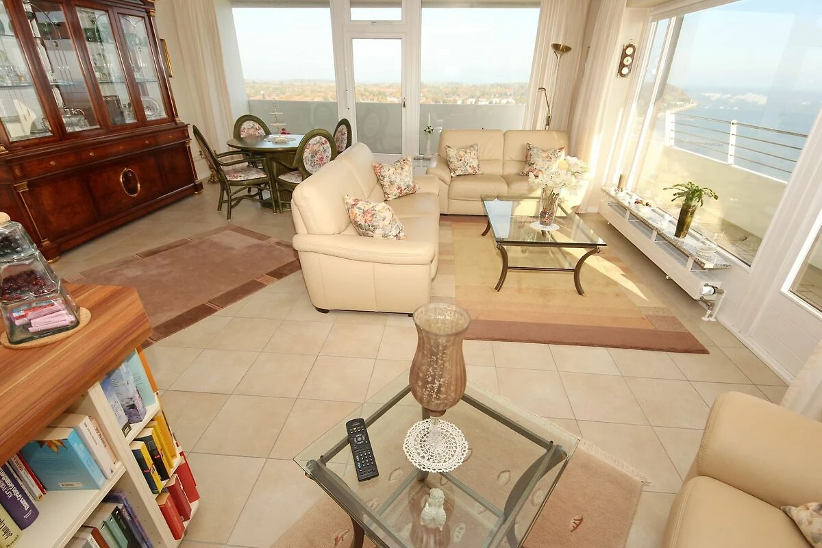 Dieses elegante 2-Zimmer-Appartement hat eine exklusive Ausstattung, die allen Ansprüchen entspricht und sofort zum Wohlfühlen einlädt. Der grosszügige, helle Wohnraum hat eine moderne, offene Einbauküche. Die weitere Einrichtung besteht aus einer schönen, dreiteiligen Couchgarnitur mit Tischen, einer Essecke direkt am Fenster und einem antiken Glasvitrinenschrank. Im Schlafzimmer befinden sich ein grosses, bequemes Doppelbett (2x 90 cm x 200 cm) und ein geräumiger Einbaukleiderschrank. Das moderne Duschbad erreichen Sie vom Flur. Beide Wohnräume sind hell und freundlich und haben einen Zugang zum grossen Eckbalkon. Hier geniessen Sie einen uneingeschränkten Panoramablick direkt auf die Ostsee und zur Lübecker Bucht mit lebhaftem Schiffsverkehr.