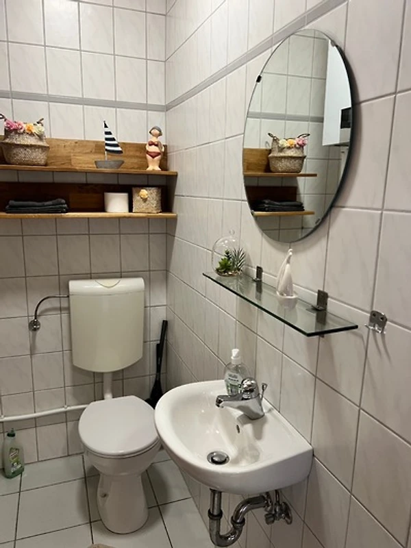 Ein kompaktes Bad mit Dusche und Waschmaschine sowie ein separates WC bieten Funktionalität auf kleinem Raum.