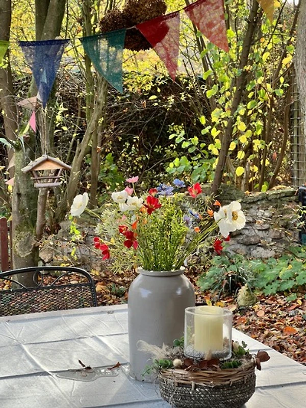 Ein schöner Garten mit alten Bäumen, eine überdachte Terrasse für laue Sommerabende und ein behaglicher Wohn-/Essbereich mit gut ausgestatteter Küche erwarten Sie.