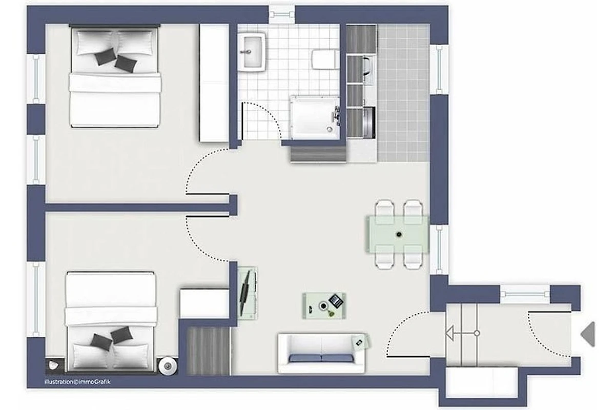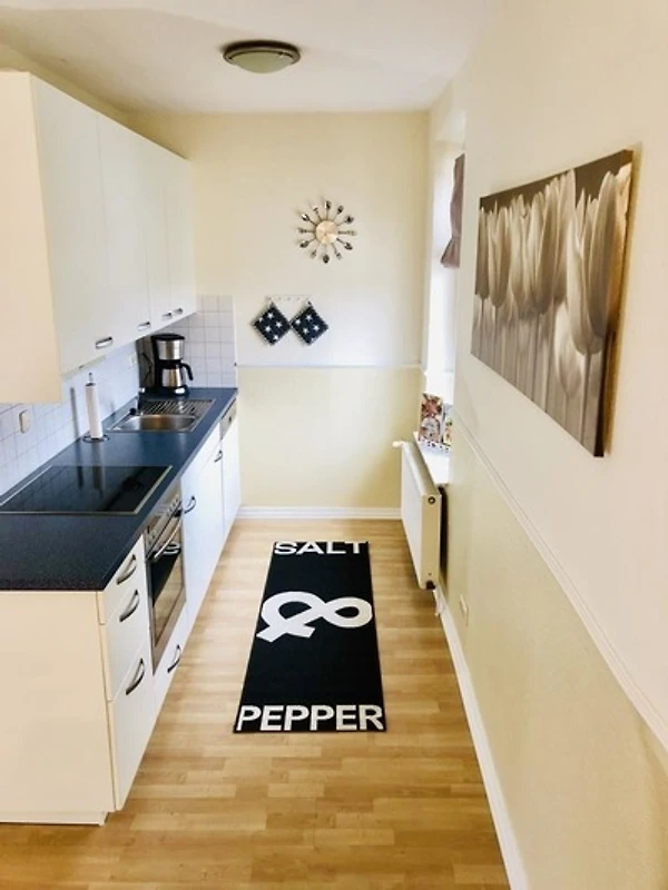 Der Wohnbereich mit offener, vollausgestatteter Küche (u.a. mit Ceranfeld, Geschirrspüler, Toaster, Kühlschrank und Mikrowelle) bietet sowohl Platz für einen Esstisch mit Stühlen als auch für ein bequemes 3er Sofa. Die zwei getrennten Schlafzimmer mit jeweils einem Doppelbett und geräumigen Kleiderschränken lassen sowohl Familien als auch Pärchen entspannt Urlauben. Für schlechtes Wetter befinden sich im Wohnbereich ein Flachbild TV, Hi-Fi Anlage mit DVD Funktion, eine Auswahl an Büchern und Gesellschaftsspielen. Zur Wohnung gehört auch noch eine Gemeinschaftswaschküche mit Waschmaschine und Trockner.