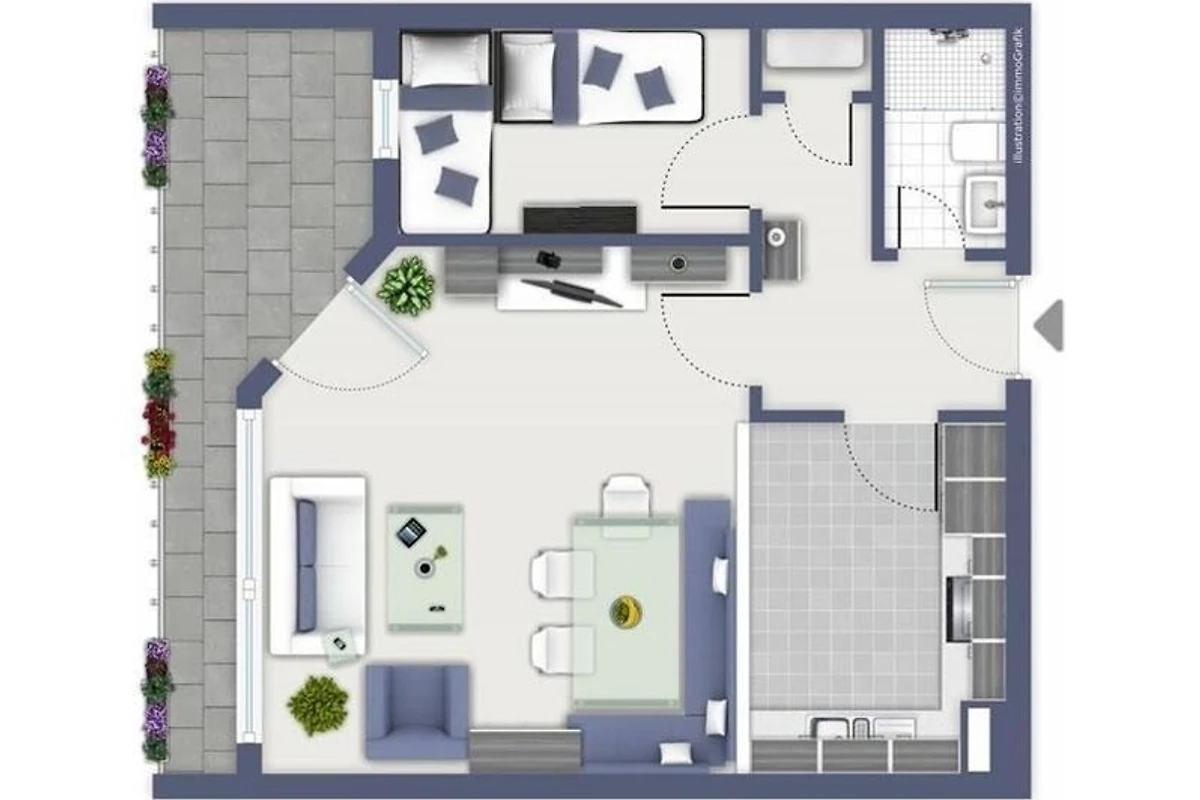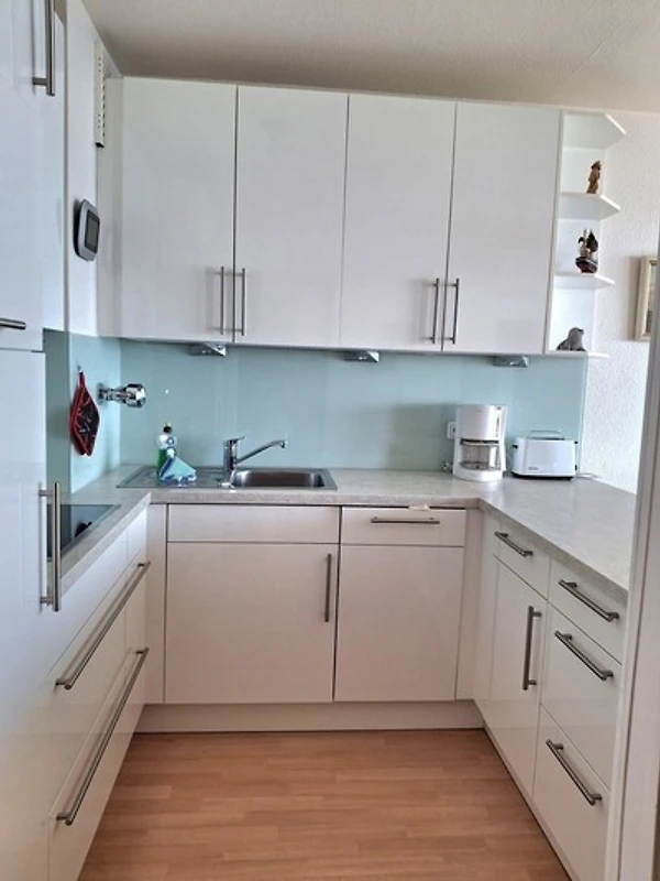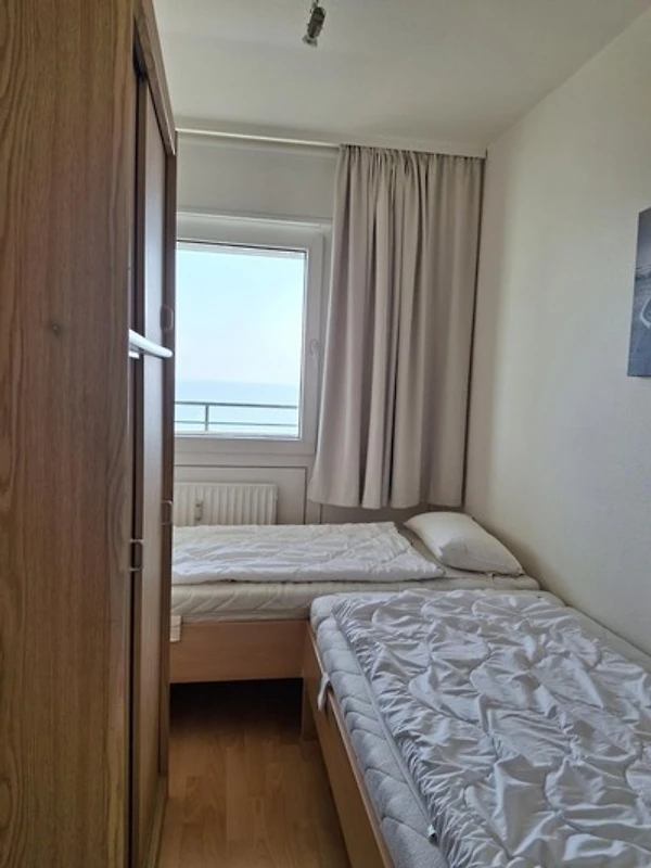 Die Wohnung 44 befindet sich in der 4. Etage und hat herrlichen Seeblick. Das Wohnzimmer hat eine gemütliche Sitzecke, welche man zu einer Schlafmöglichkeit wandeln kann, Essecke und natürlich einen Balkon. Im Schlafzimmer befindet sich zwei Einzelbetten. Die Küche ist ausgestattet mit Geschirrspüler etc. und hat eine Durchreiche zum Essbereich im Wohnzimmer.