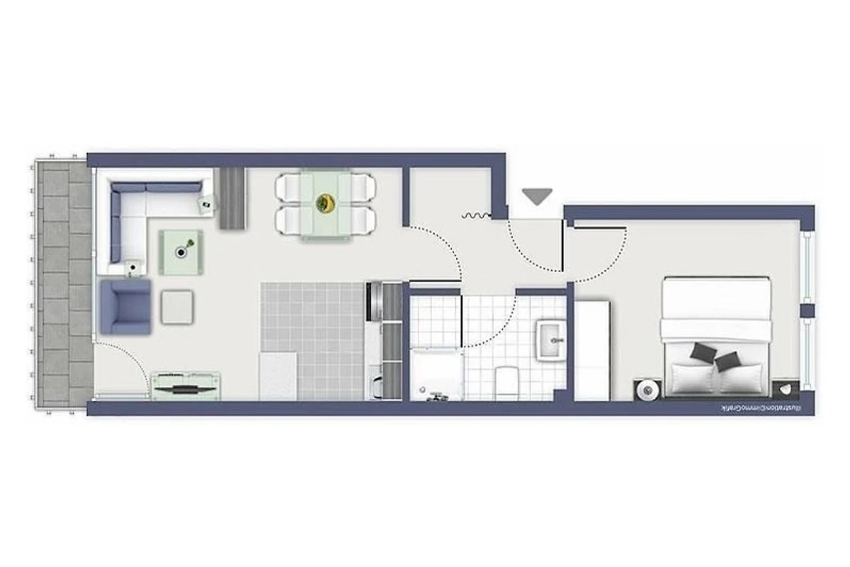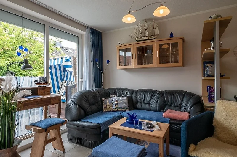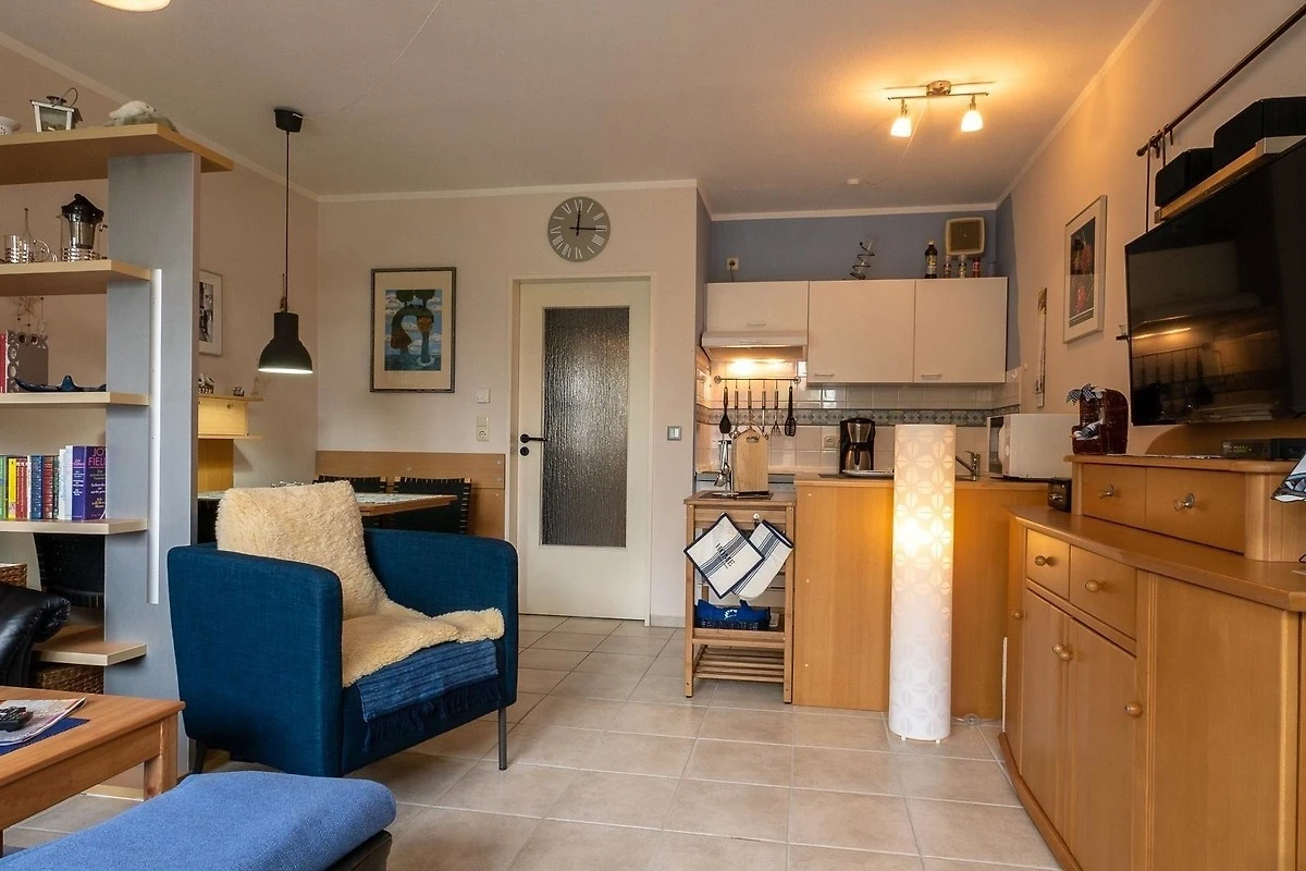 Die Ferienwohnung befindet sich im 1. OG links (Eckwohnung) in einem Reiheneckhaus mit 6 Wohneinheiten. Unsere Wohnung liegt ca. 200m vom Strand entfernt und besteht aus folgenden Räumlichkeiten: Wohnzimmer mit gemütlicher Couch-Sitzeck und mit einem durch Raumteiler abgetrennten Essplatz sowie einer Küchenzeile. Schlafzimmer mit Doppelbett (200 x 180cm) und Kleiderschrank. Bad mit Dusche und Toplader-Waschmaschine. Flur mit Garderobe und abgetrennter Abstellmöglichkeit. Des Weiteren gehört ein schwenkbarer 40 Zoll Farb-TV, eine Mini-Stereo-Anlage, ein Balkon mit Original Ostseestrandkorb sowie ein Tisch mit zwei Stühlen, Fenster mit elektrischen Jalousien sowie der Tiefgaragenstellplatz Nr. 3 mit klappbarem 2er Fahrrad-Wandträger im Haus 4d zur Ausstattung. WLAN ab 2022