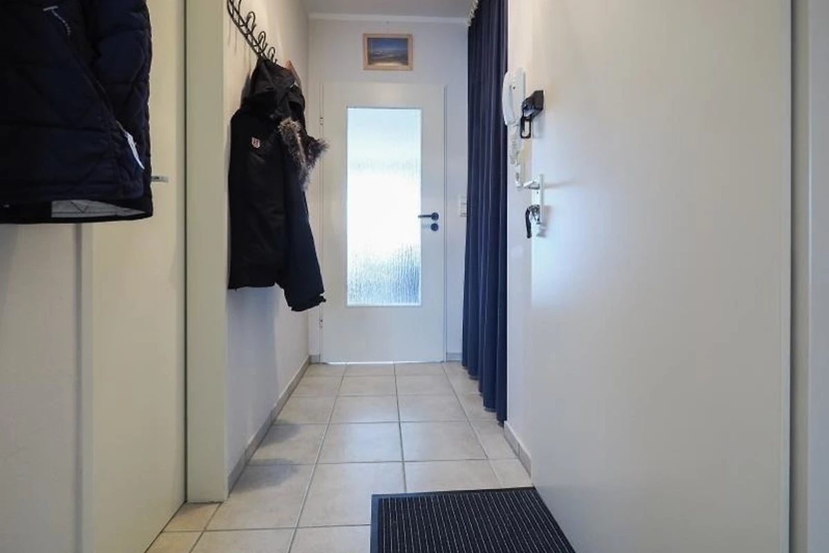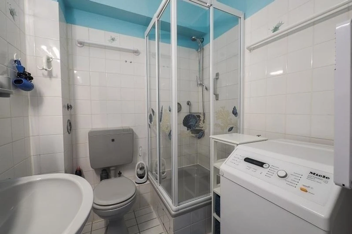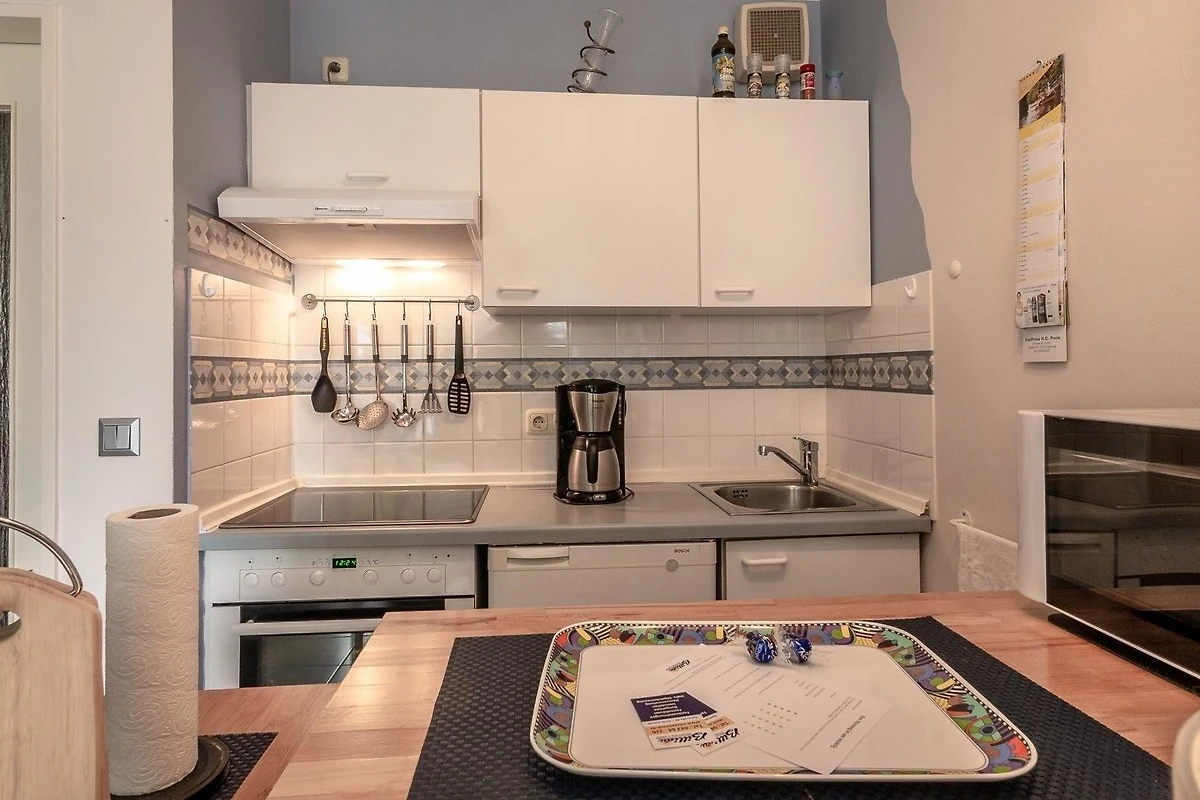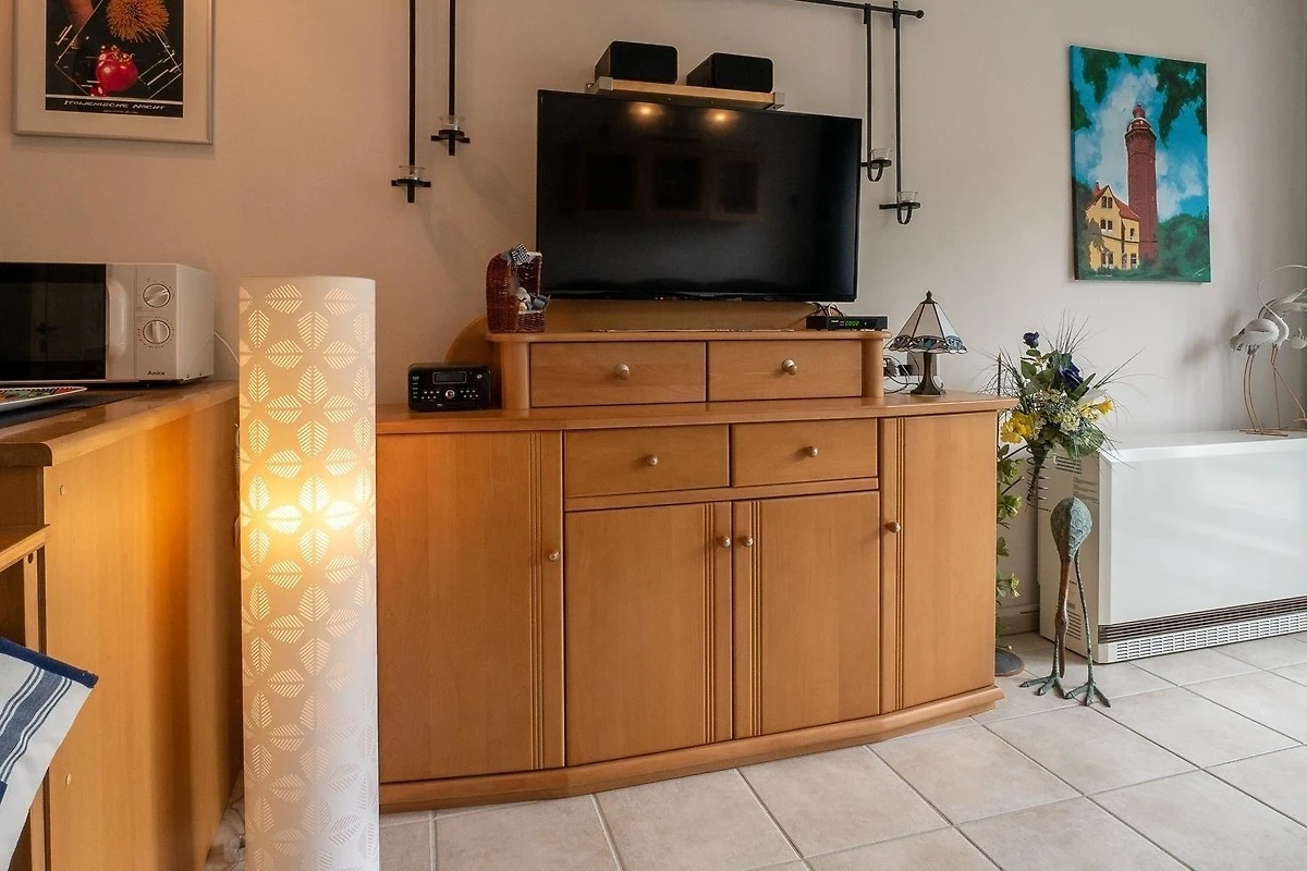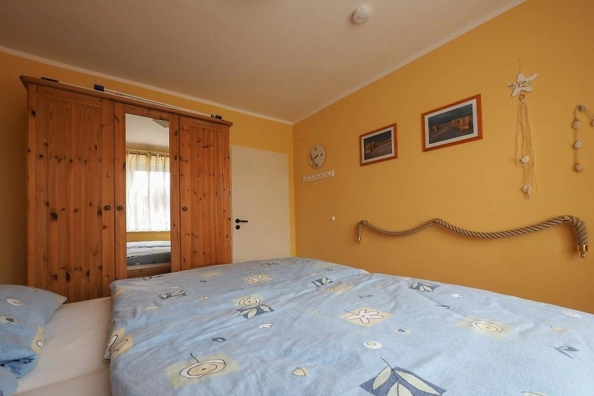 Die Ferienwohnung befindet sich im 1. OG links (Eckwohnung) in einem Reiheneckhaus mit 6 Wohneinheiten und besteht aus folgenden Räumlichkeiten: Wohnzimmer mit gemütlicher Couchecke und mit einem durch Raumteiler abgetrennten Essplatz sowie einer Küchenzeile. Schlafzimmer mit Doppelbett (200 x 180cm) und Kleiderschrank. Bad mit Dusche und Waschmaschine. Flur mit Garderobe und abgetrennter Abstellmöglichkeit. Des Weiteren gehört ein schwenkbarer 40 Zoll Farb-TV und eine Mini-Stereo-Anlage zum Inventar.