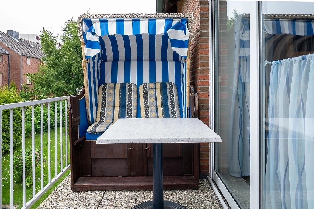 Ein Balkon mit Original Ostseestrandkorb sowie ein Tisch mit zwei Stühlen und der Tiefgaragenstellplatz Nr. 3 mit einem klappbarem 2er Fahrrad-Wandträger stehen Ihnen zur Verfügung.
