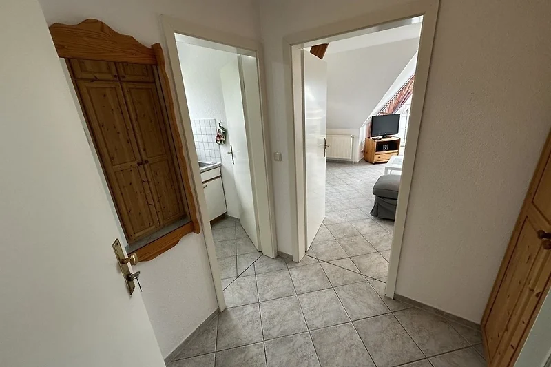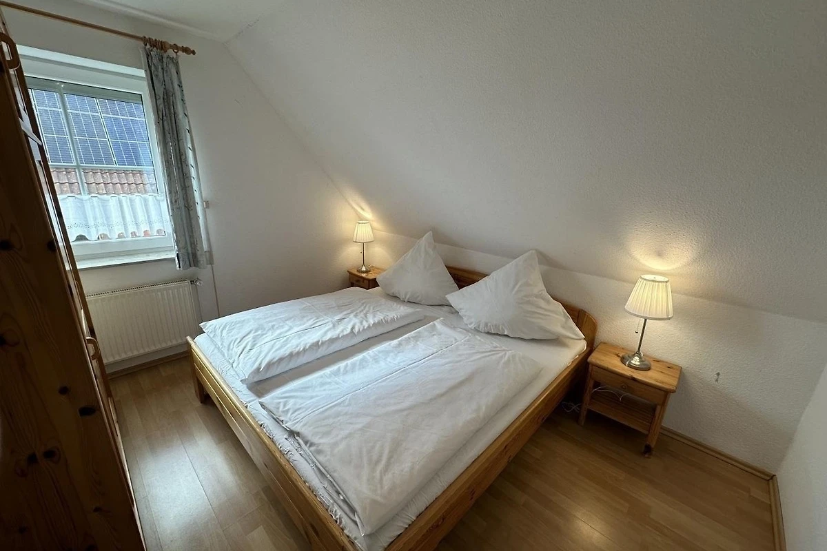 Die Ferienwohnung geht über 2 Etagen. Im 1. OG befindet sich das Wohn-Esszimmer mit Balkon, Küche und Dusch/WC. Eine steile Treppe führt in den Spitzboden. Hier steht ein Doppelbett.