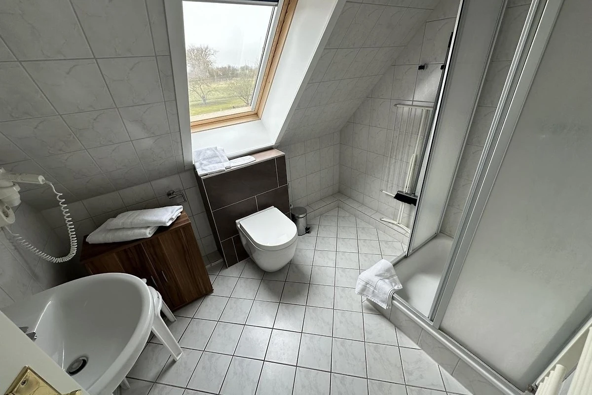 Die Ferienwohnung 5 geht über 2 Etagen mit Balkon nach Süden und Blick über die Felder. Im 1. OG befindet sich das Wohn-Esszimmer mit Balkon, Küche und Dusch/WC. Eine Treppe führt in den Spitzboden( steile Treppe) . Hier steht das Doppelbett