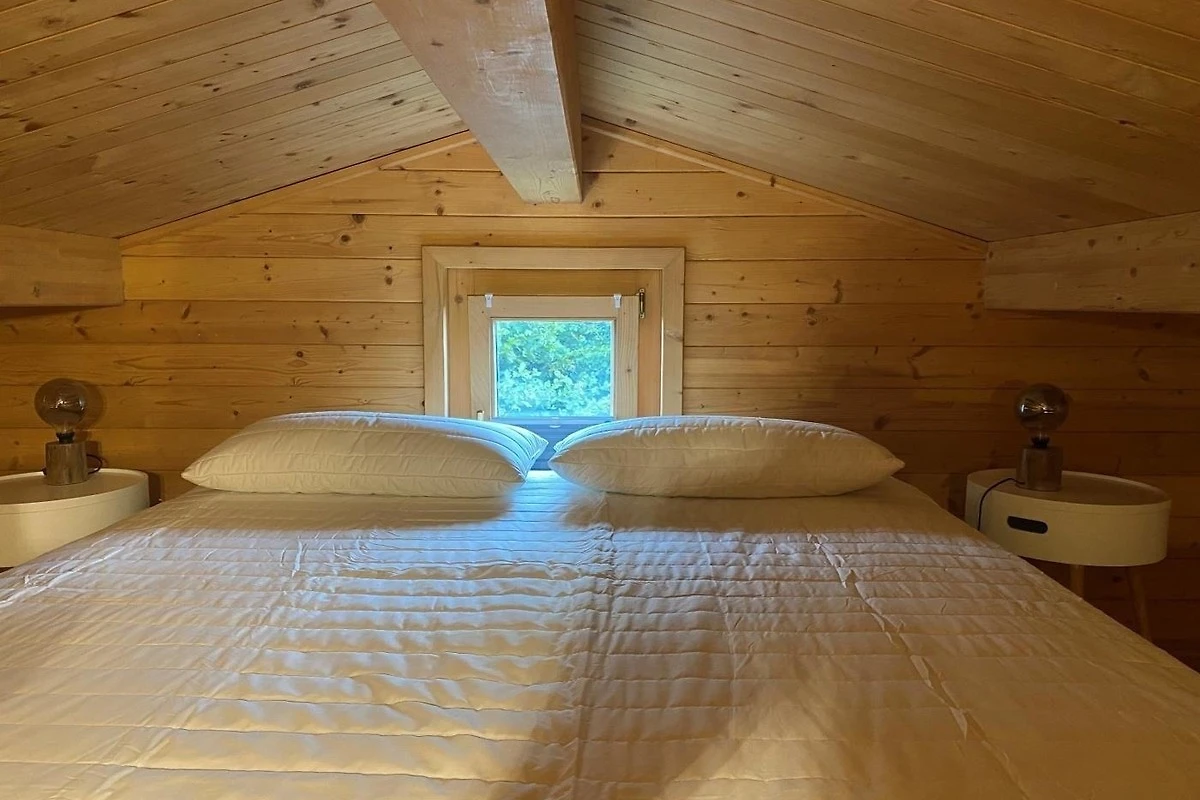 Der Bungalow besteht aus einem gemütlichen Wohnzimmer mit Sitzecke (Schlafsofa) und einem Essbereich für 4 Personen. Von dem Wohnzimmer aus geht eine steile Treppe unter das Dach, wo sich das Doppelbett befindet. Das Kinderzimmer verfügt über ein Etagenbett. An das Wohnzimmer grenzt die Küche mit Backofen und Ceranfeld und das Bad mit Dusche und WC. Der Bungalow hat in jedem Raum Fenster und ist hell und freundlich.