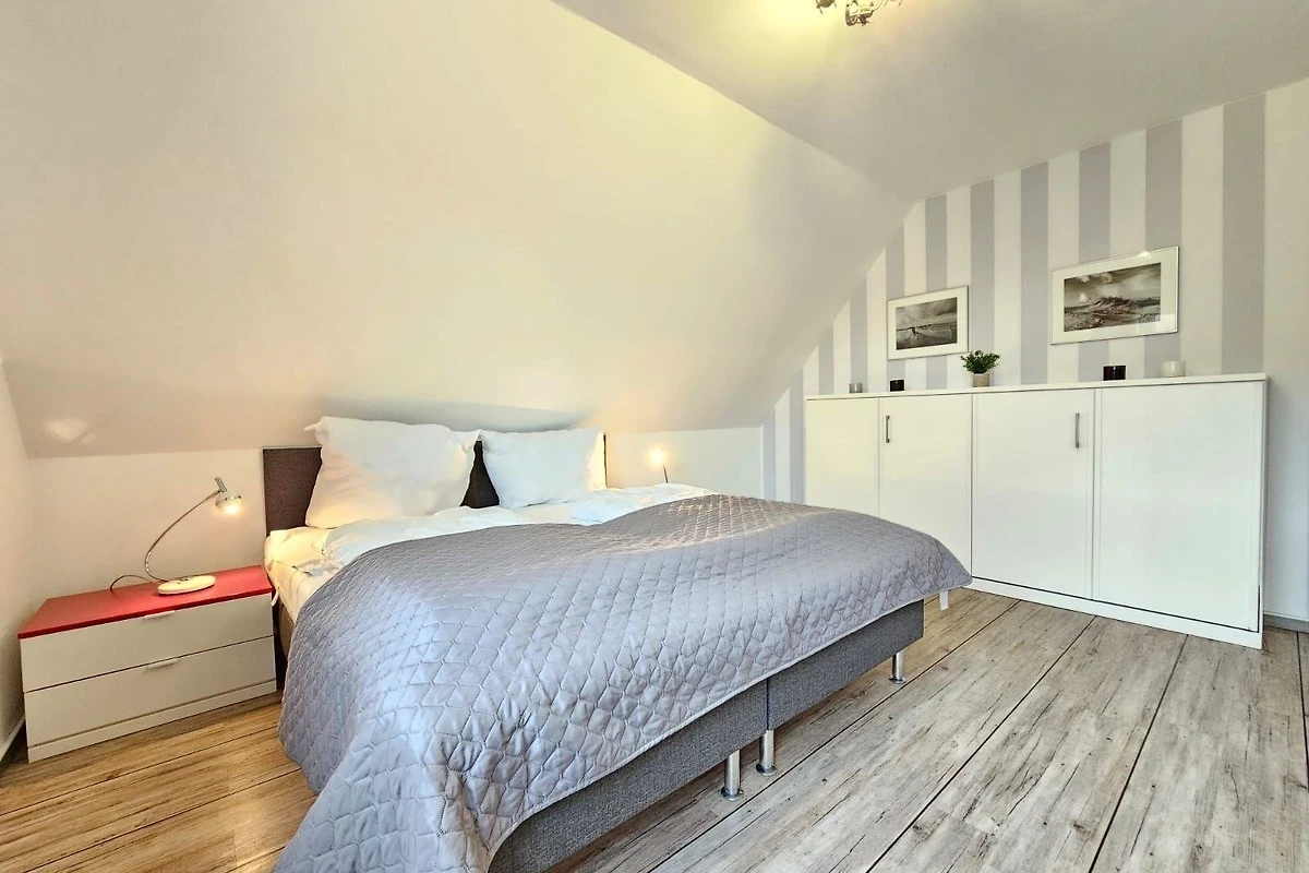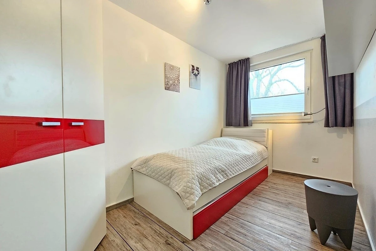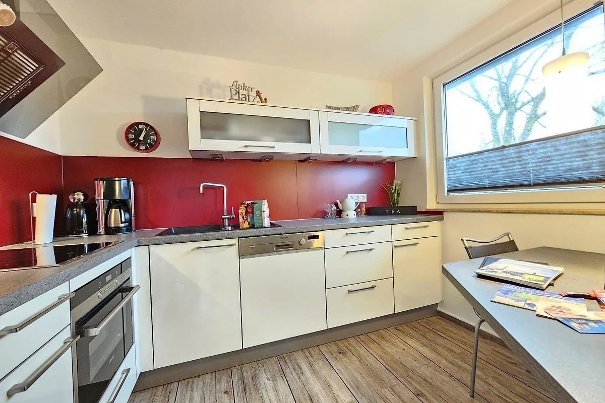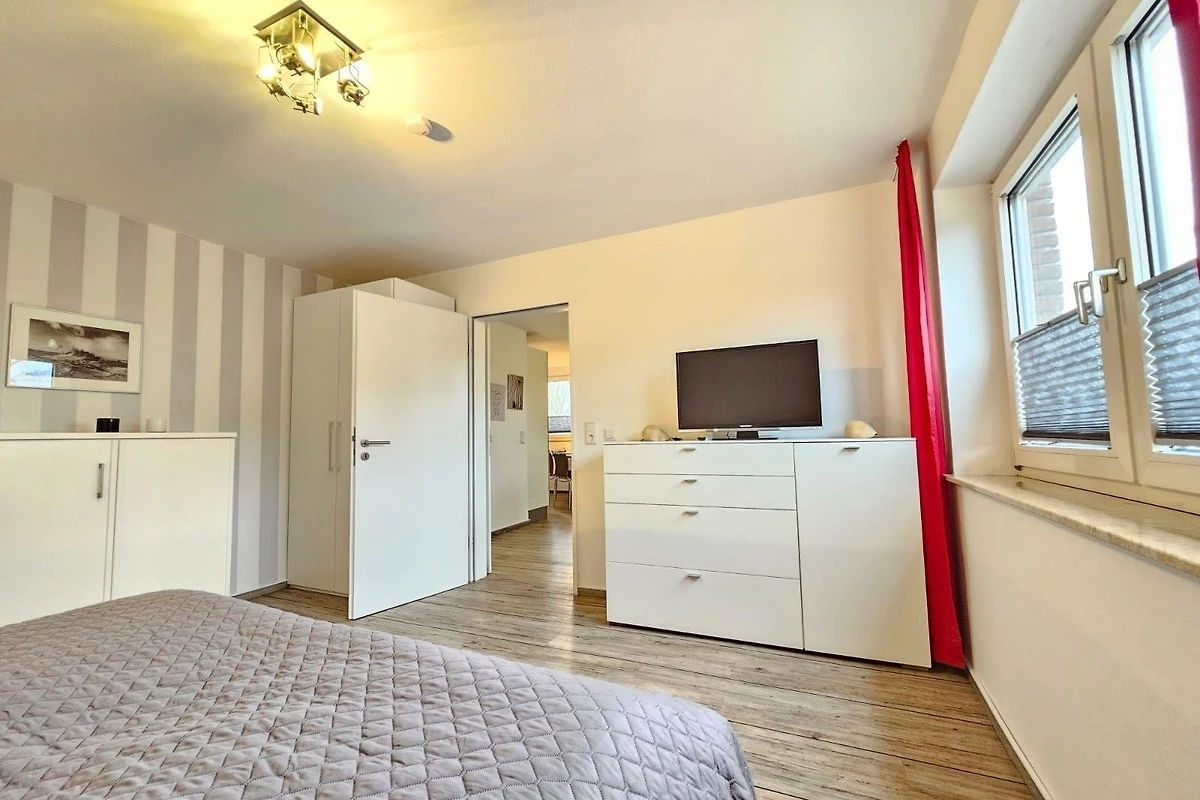 Die Ferienwohnung Famke im Mienhus in Norddeich bietet eine einladende, familienfreundliche Ausstattung in einer komfortablen Umgebung. Das Elternschlafzimmer verfügt über ein Doppelbett und Rollläden, während das Kinderzimmer mit einem Kojenbett und einem Klappbett Platz für bis zu drei Kinder bietet. Der helle Wohnbereich ist mit einer voll ausgestatteten Küchenzeile, einschliesslich Ceranfeld, Backofen und Kühlschrank, ideal für die Selbstversorgung. Das Badezimmer überzeugt mit natürlichem Licht durch ein Fenster. Zur Ausstattung gehören zudem SAT-TV-Anschlüsse und zusätzliche Fernseher in den Schlafzimmern. Die Wohnung ist geeignet für bis zu fünf Erwachsene. Gemeinschaftliche Einrichtungen wie eine Waschmaschine und ein Wäschetrockner sind gegen Gebühr verfügbar. Bettwäsche und Handtücher können optional hinzugebucht werden. Die freundliche und gemütliche Atmosphäre lädt zu entspannten Urlaubstagen an der Nordsee ein.
