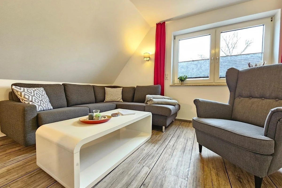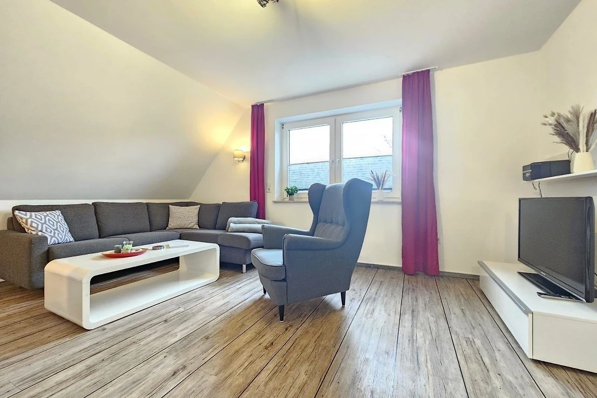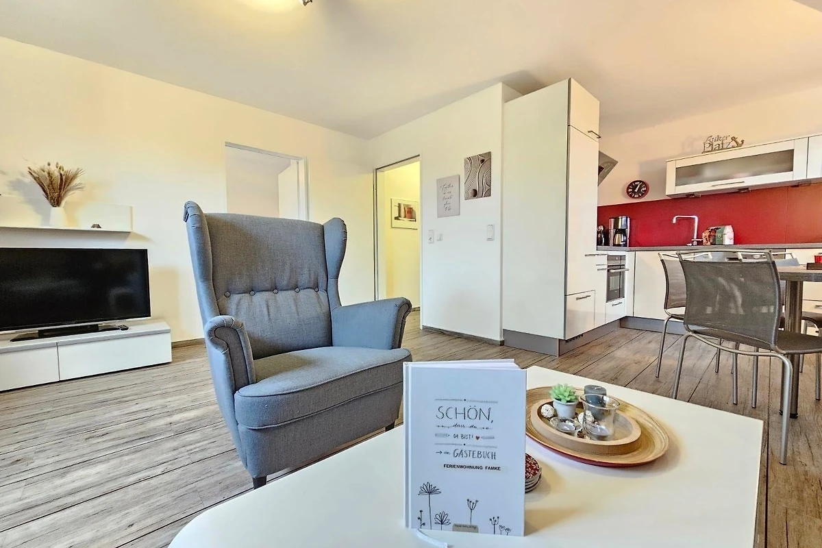 Die Ferienwohnung Famke bietet Platz für fünf Personen und beinhaltet zahlreiche kinderfreundliche Ausstattungen. Hunde sind auf der gemeinschaftlichen Terrasse nicht gestattet. Anreise erfolgt individuell, die Schlüsselübergabe wird vorab organisiert. Bettwäsche und Handtücher sind gegen Aufpreis buchbar.