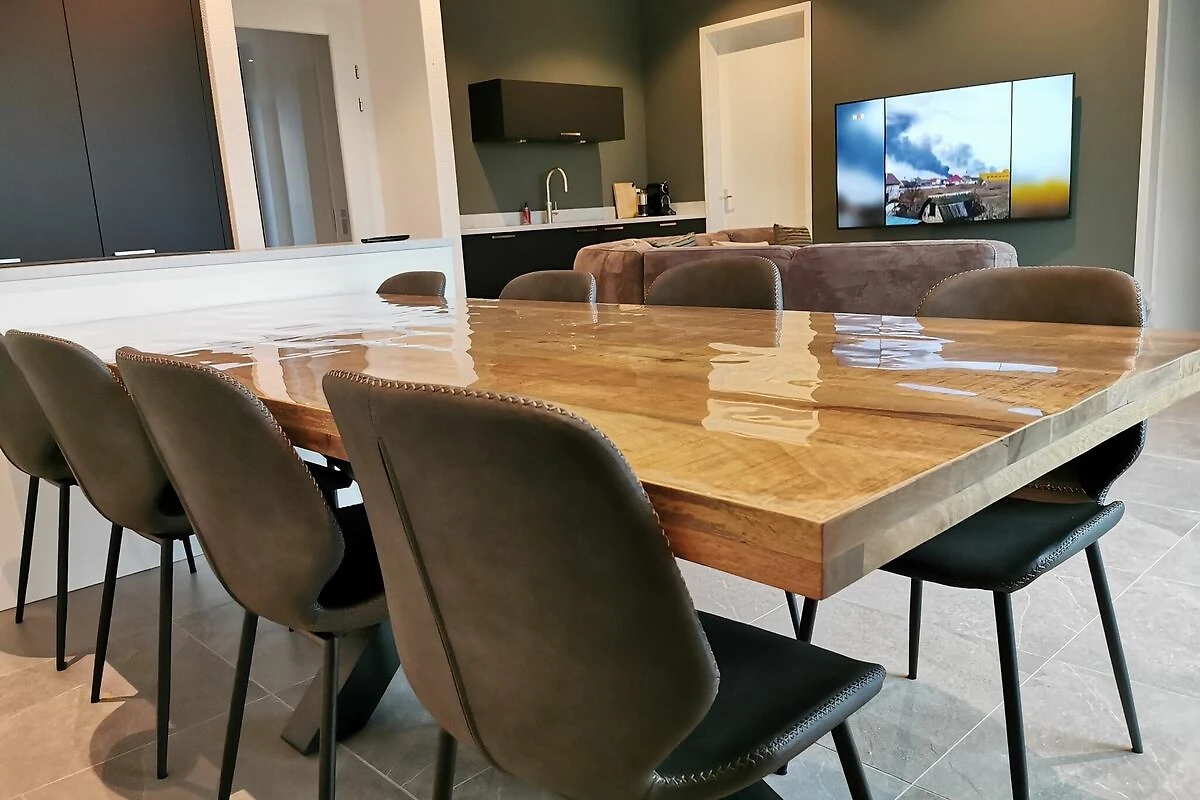 Anlegesteg, Babybett, Badewanne oder Dusche, Waschmaschine, Klimaanlage, Terrasse, Garten, Gartenmöbel, Grill, Parkplatz, Trampolin, Sonnenschirm, Hochstuhl