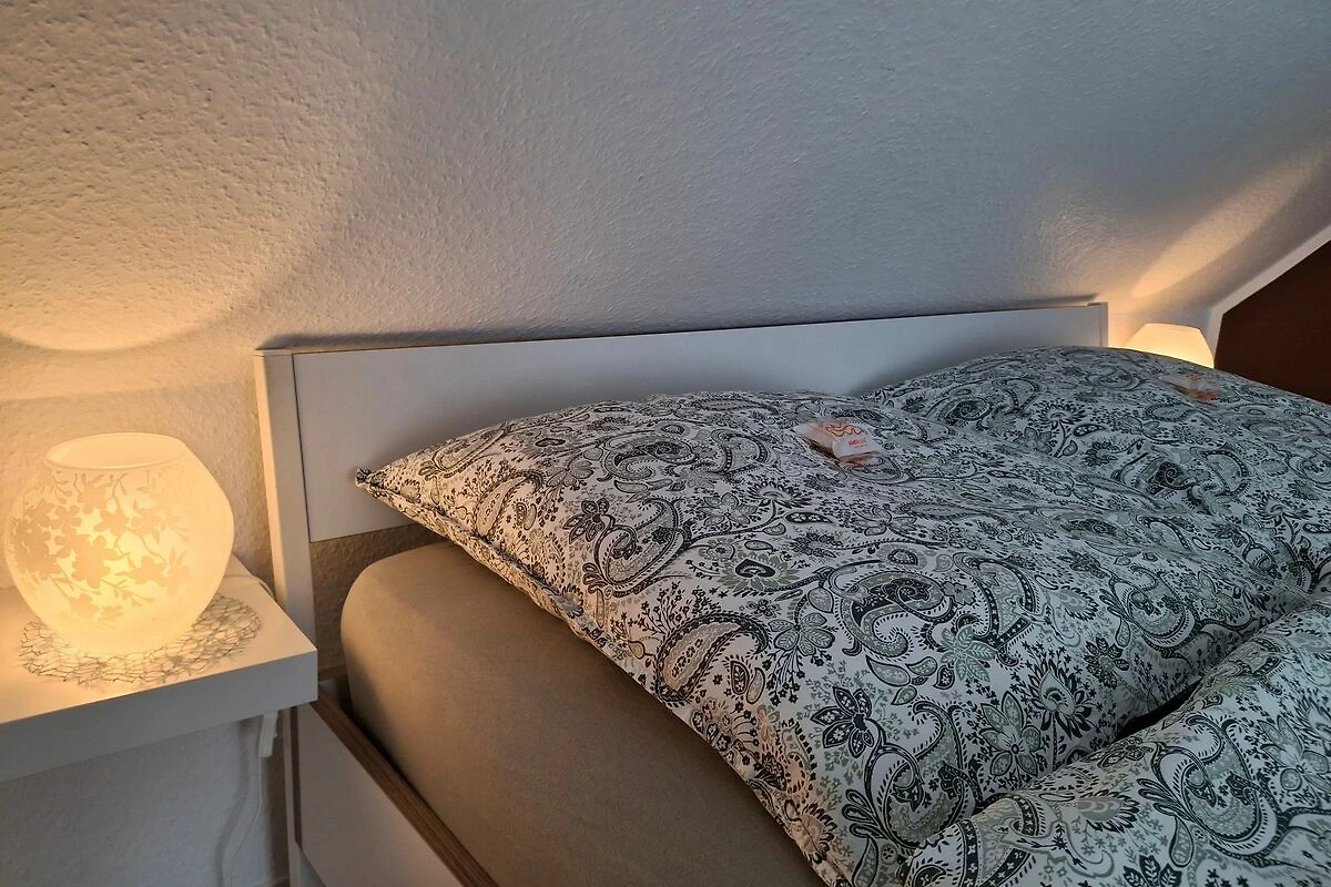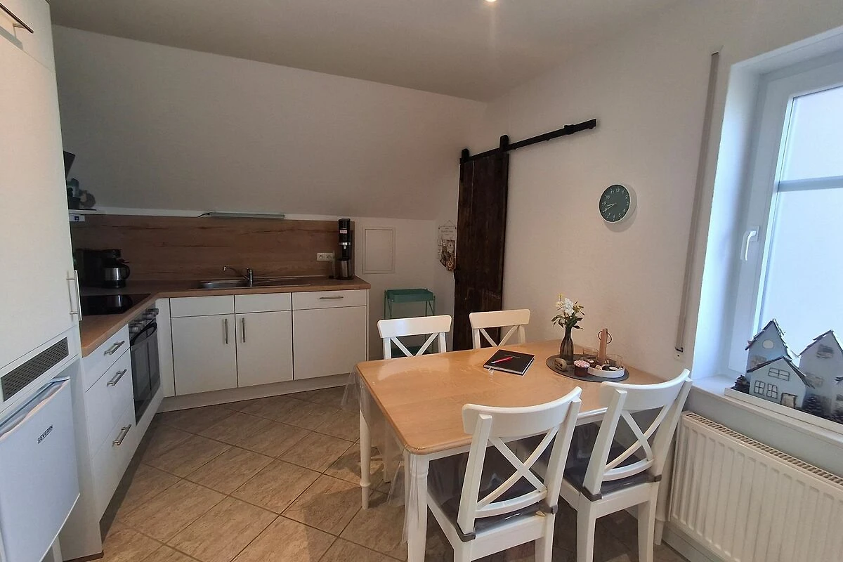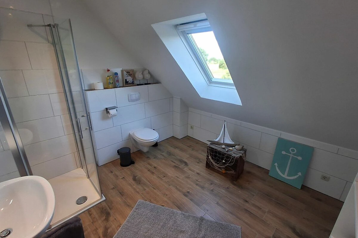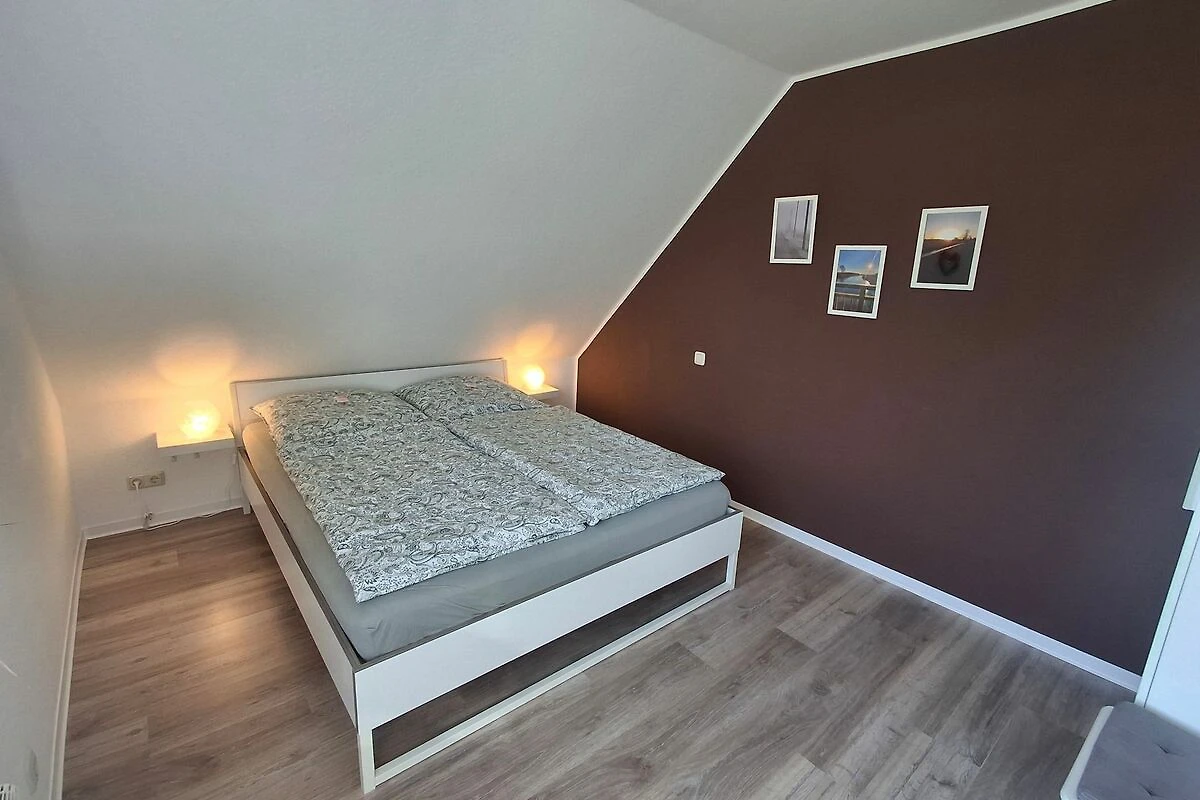 70 qm grosse Ferienwohnung im Obergeschoss für vier Personen. Anfang 2022 renovierte, modern und mit viel Liebe zum Detail eingerichtete helle Räume. Ihnen stehen ein Schlafzimmer mit französischem Bett (1,60 x 2 m) sowie ein Schlafzimmer mit zwei getrennt stehenden Betten (0,90 x 2 m) zur Verfügung. In der hellen Küche mit voll ausgestatteter Küchenzeile und Essbereich können Sie morgens ausgiebig frühstücken und ruhig und erholt in den Tag starten. Das Wohnzimmer bietet Ihnen eine gemütliche Sofa-Garnitur mit Flachbild-Fernseher. Das Badezimmer ist mit einer ebenerdigen Dusche und einem WC ausgestattet.