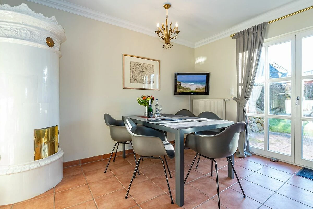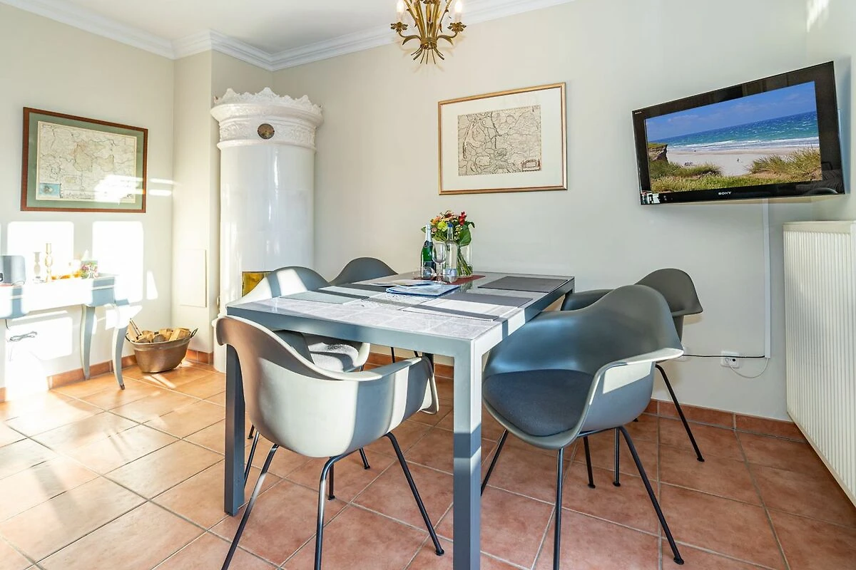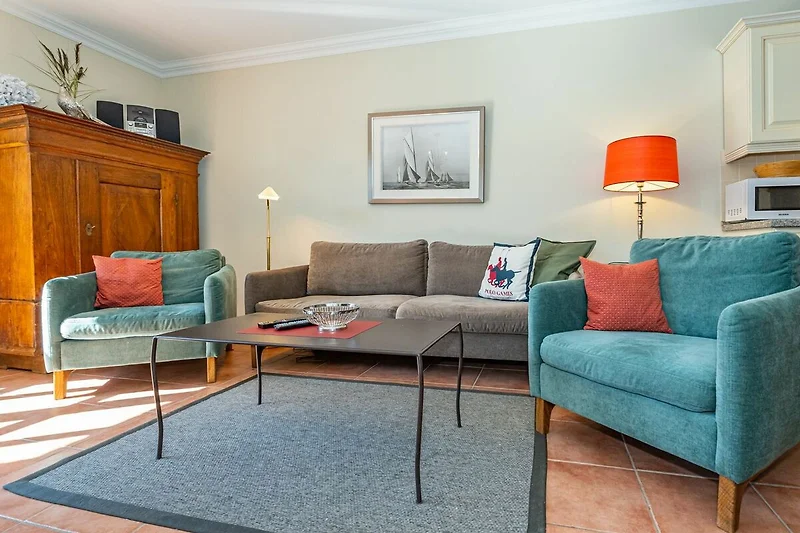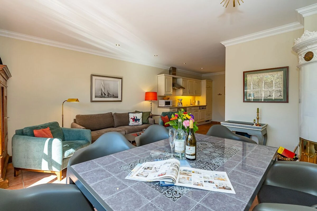 Das Wohnzimmer ist mit einer gemütlichen Couchgarnitur (Zweisitzer-Couch und zwei urgemütliche Ohrensessel), Essplatz für 6 Personen, weissem antiken Kachelofen, grossem Kabel-Flachbild-TV, Radio/CD-Player und einer cremefarbenen Küche im Landhausstil ausgestattet. Kostenlose Internetnutzung per W-Lan (ohne Gewähr).