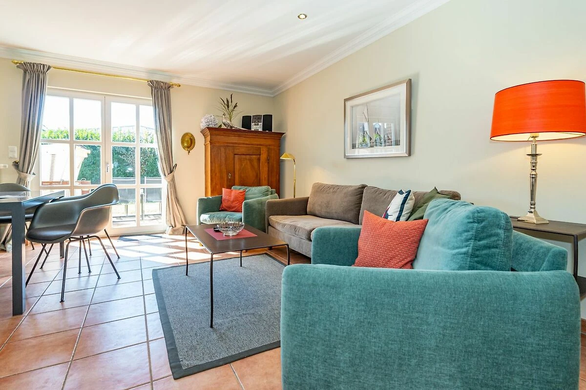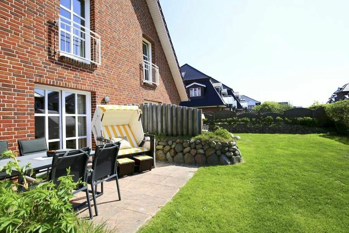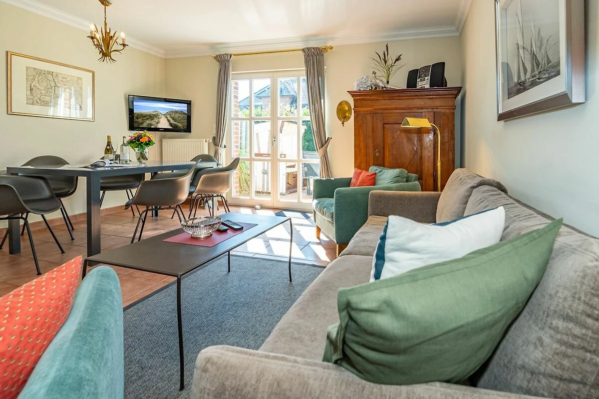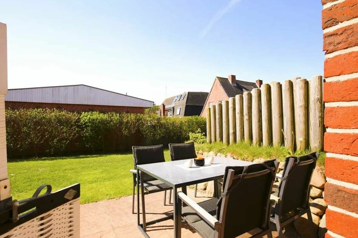 Vom Wohnzimmer betritt man die nach Süden ausgerichtete Sonnenterrasse mit Saison-Strandkorb (ca. April-Oktober) und Gartenmöbeln.