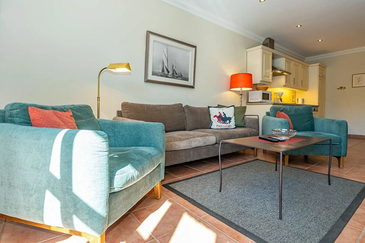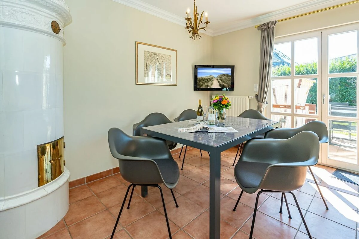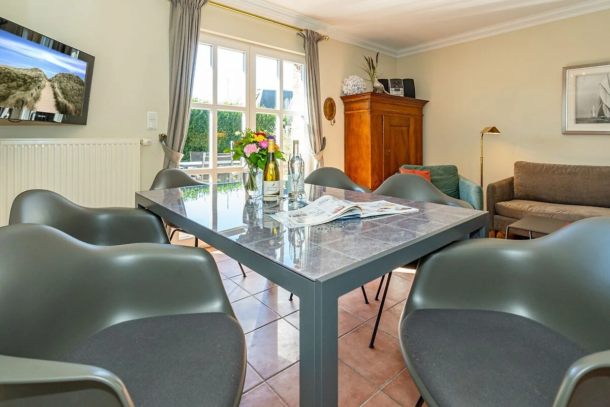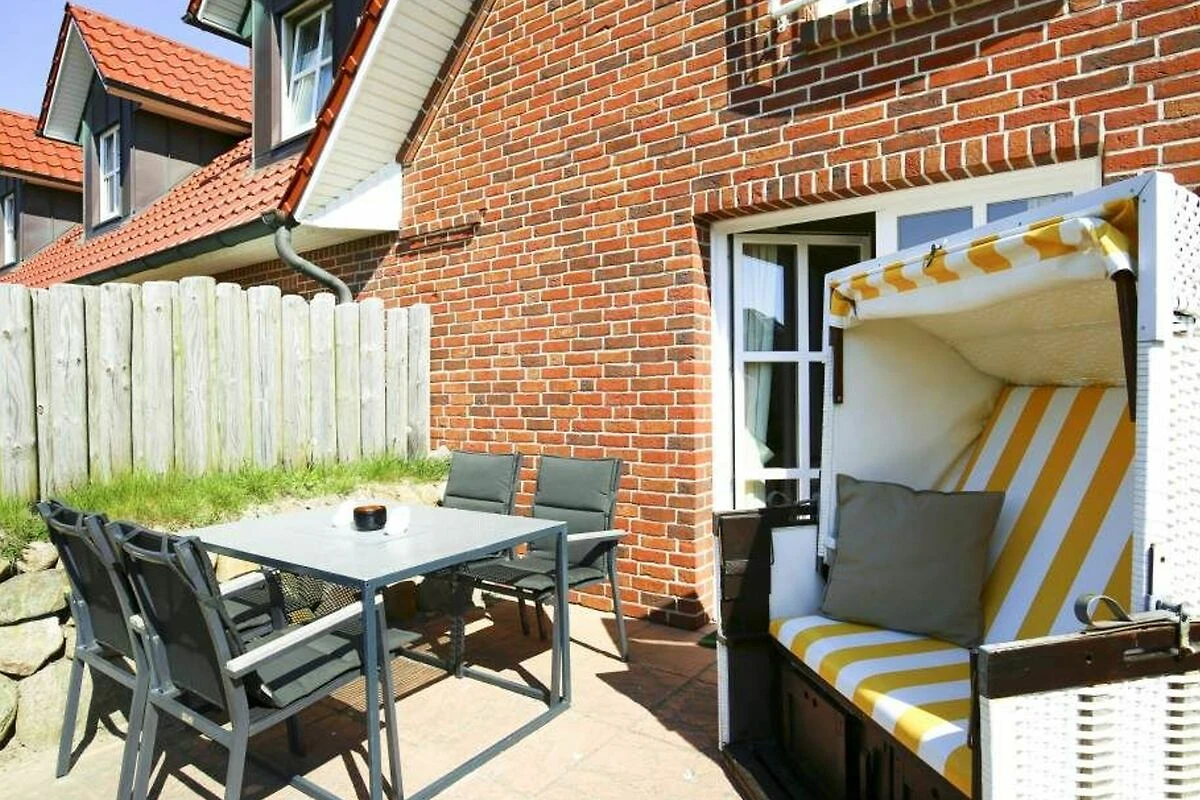 Vom Wohnzimmer betritt man die nach Süden ausgerichtete Sonnenterrasse mit Saison-Strandkorb (ca. April-Oktober) und Gartenmöbeln.