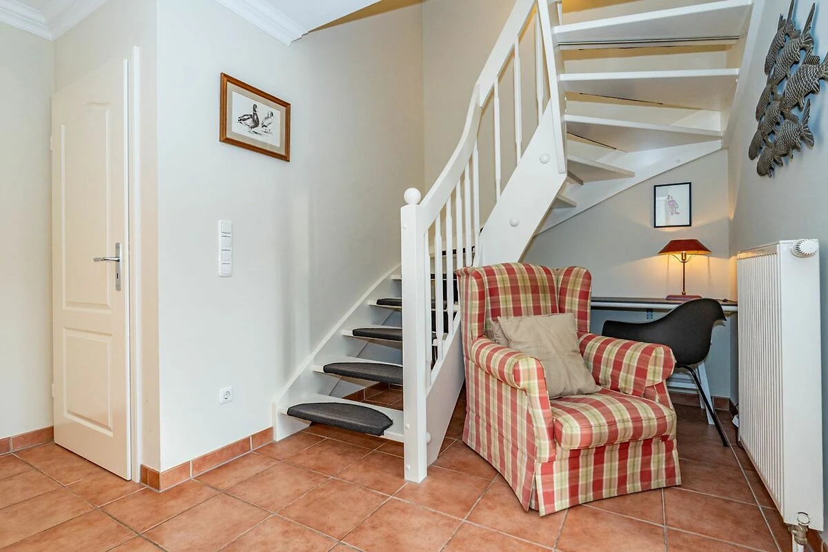 Im Erdgeschoss gelangt man von der Diele in das exklusive Wohnzimmer mit offener Einbauküche, das Duschbad/WC und in den Hauswirtschaftsraum mit Waschmaschine und Trockner.