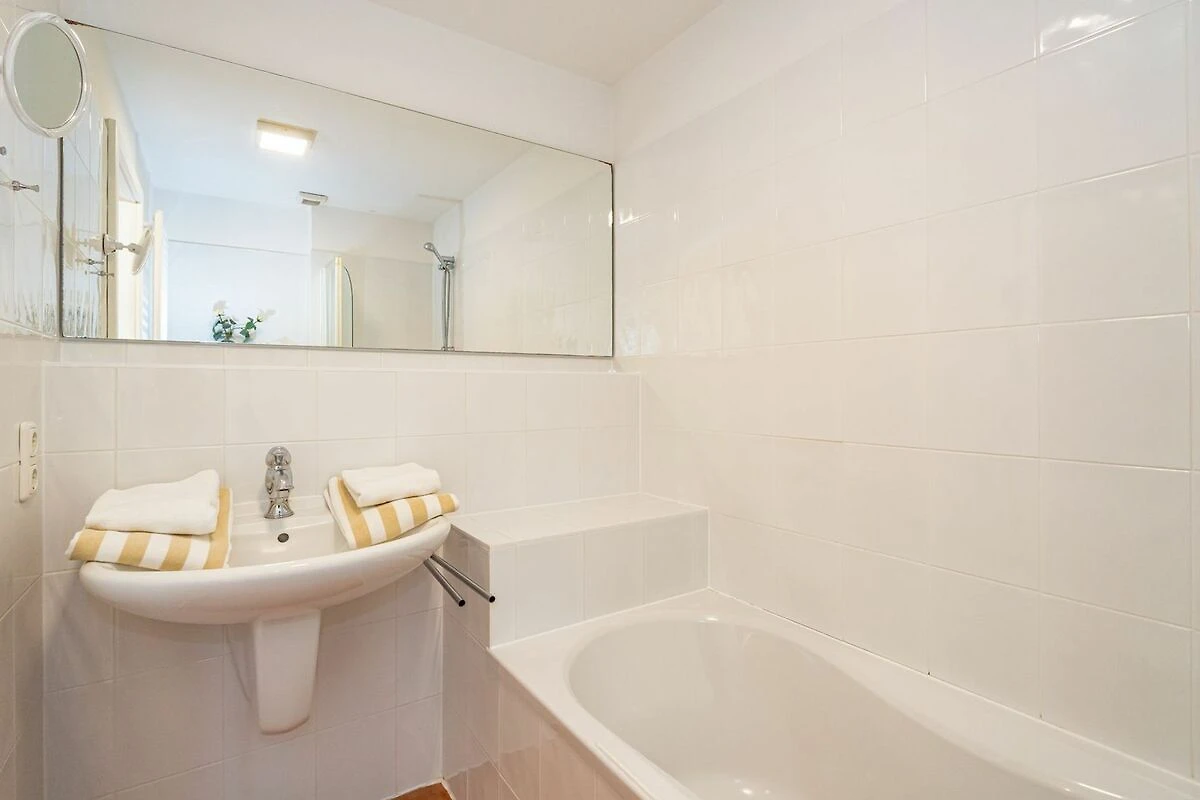 Das zweite Badezimmer besitzt eine Badewanne mit Duschvorrichtung, Waschtisch, Handtuchtrockner, WC und Fön.