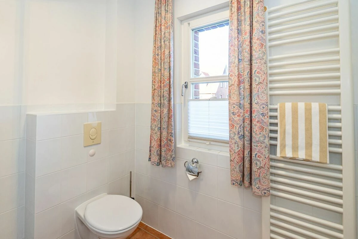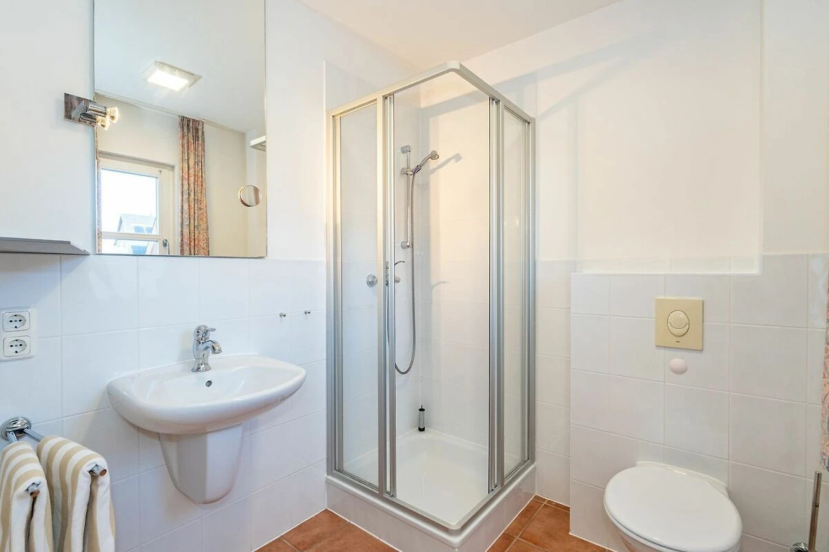 Das helle Duschbad mit Fenster ist mit Dusche, Waschtisch, Handtuchtrockner, WC und Fön ausgestattet.