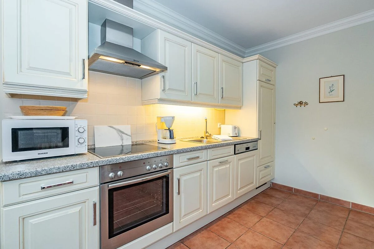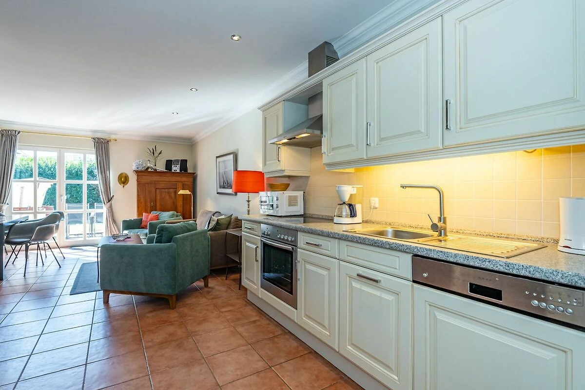 Die offene, vollausgestattete Einbauküche hat einen Geschirrspüler, einen Herd mit Backofen, 4-Platten-Ceranfeld, Mikrowelle sowie einen Kühlschrank mit 3-Sterne-Gefrierfach.