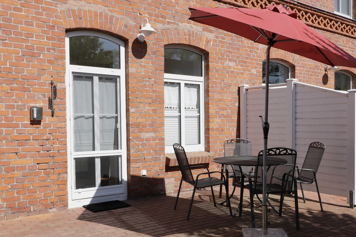 Parkplatz um die Ecke. Bequem im Erdgeschoß. Schöne Terrasse mit Sonnenschirm.