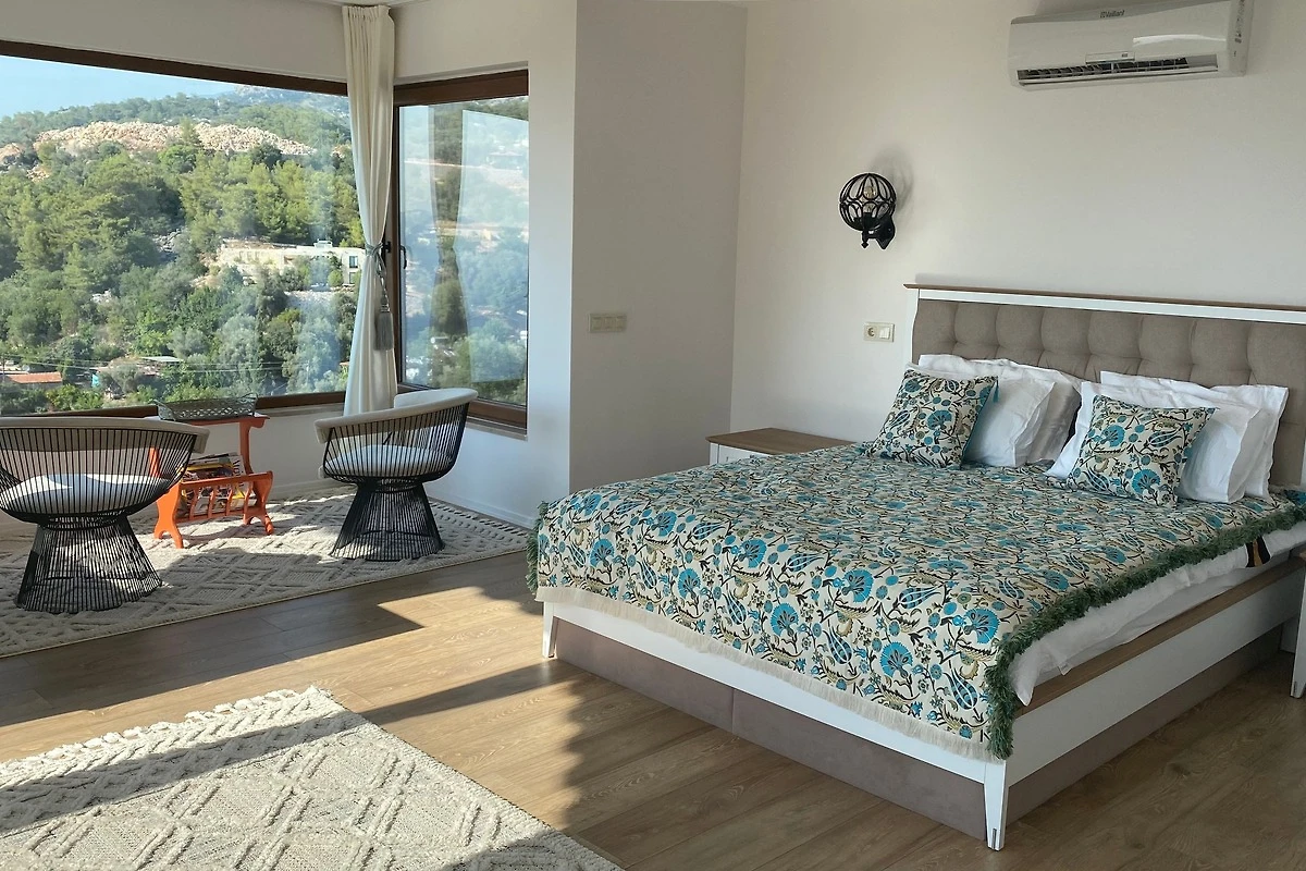 Die oberen 4 Schlafzimmer haben alle ein weitereichender Blick auf Meer, Pool und Wald. 2 Zimmer davon haben ein Balkon, ein separates Ankleidezimmer und ein eigenes Badezimmer, einmal mit einer Dusche und einmal mit einem Whirlpool. Ein drittes Badezimmer mit Dusche befindet sich ebenfalls im ersten Stock. Insgesamt 7 Schlafplätze, mit 3 Zimmern mit Queen Size Bett und 1 Zimmer mit einem 1.20 m Bett.