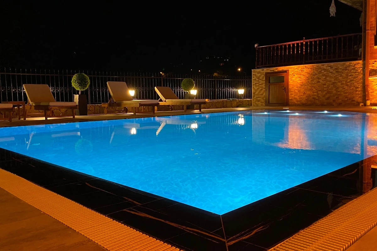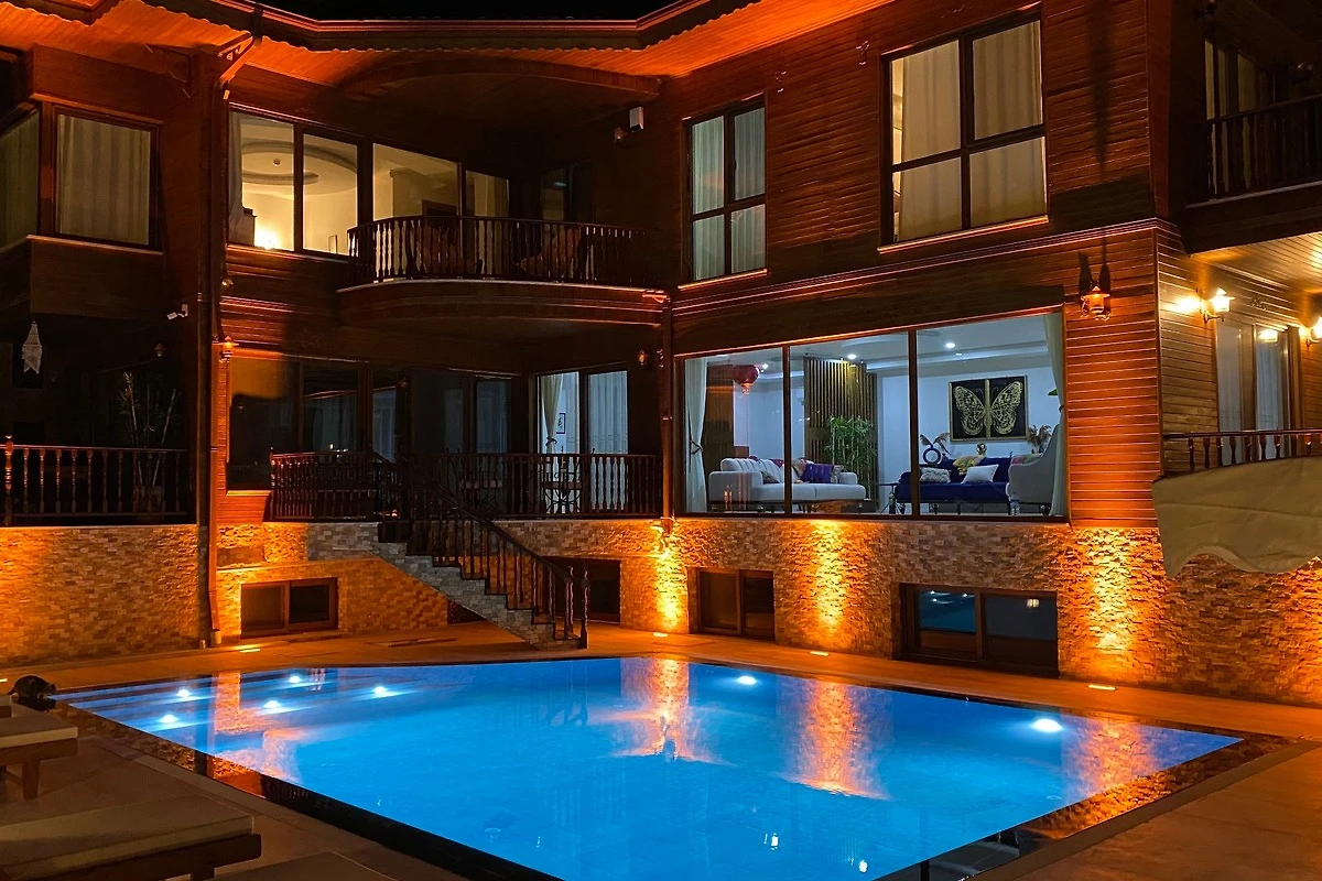 Das Haus sowie das Pool sind nachts beleuchtet.