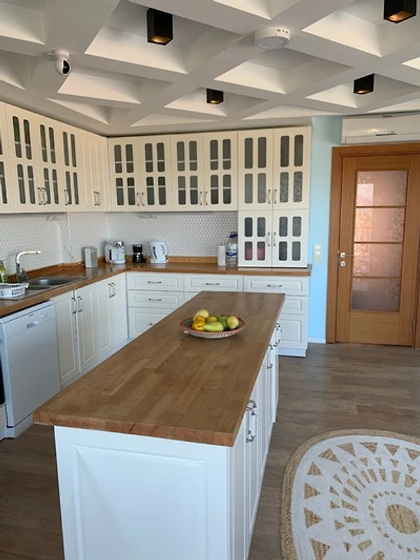 Die grosse Küche mit ihrer ganzheitlichen Ausstattung auf höchstem Niveau führt zu einer Aussen Terrasse mit gemütlicher Sitzmöglichkeiten, Am Tisch oder in der orientalischen Sitzecke.