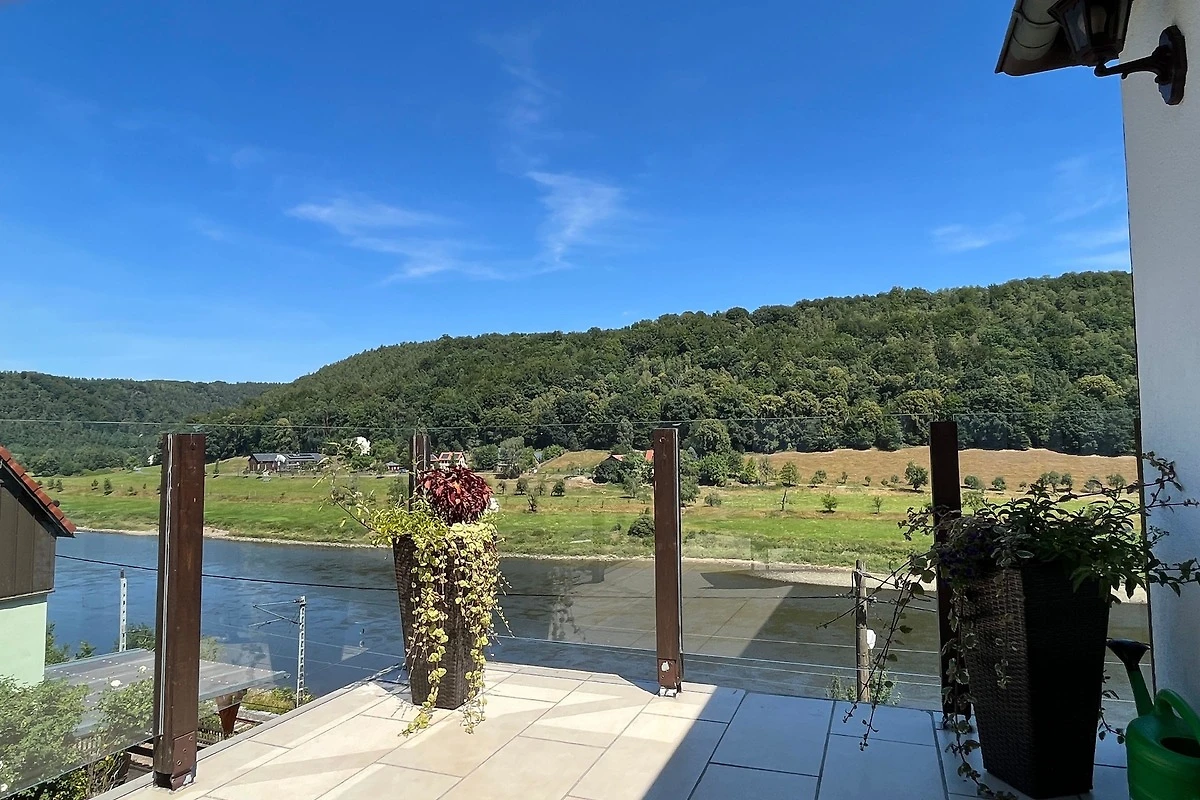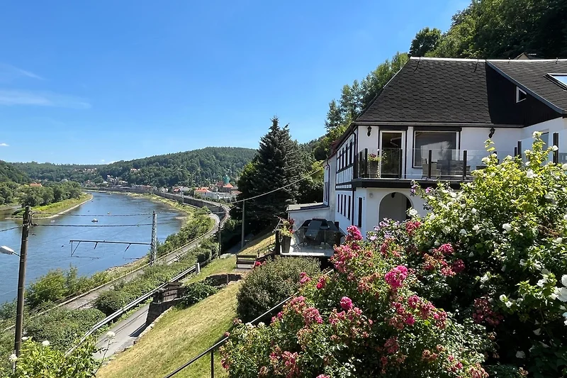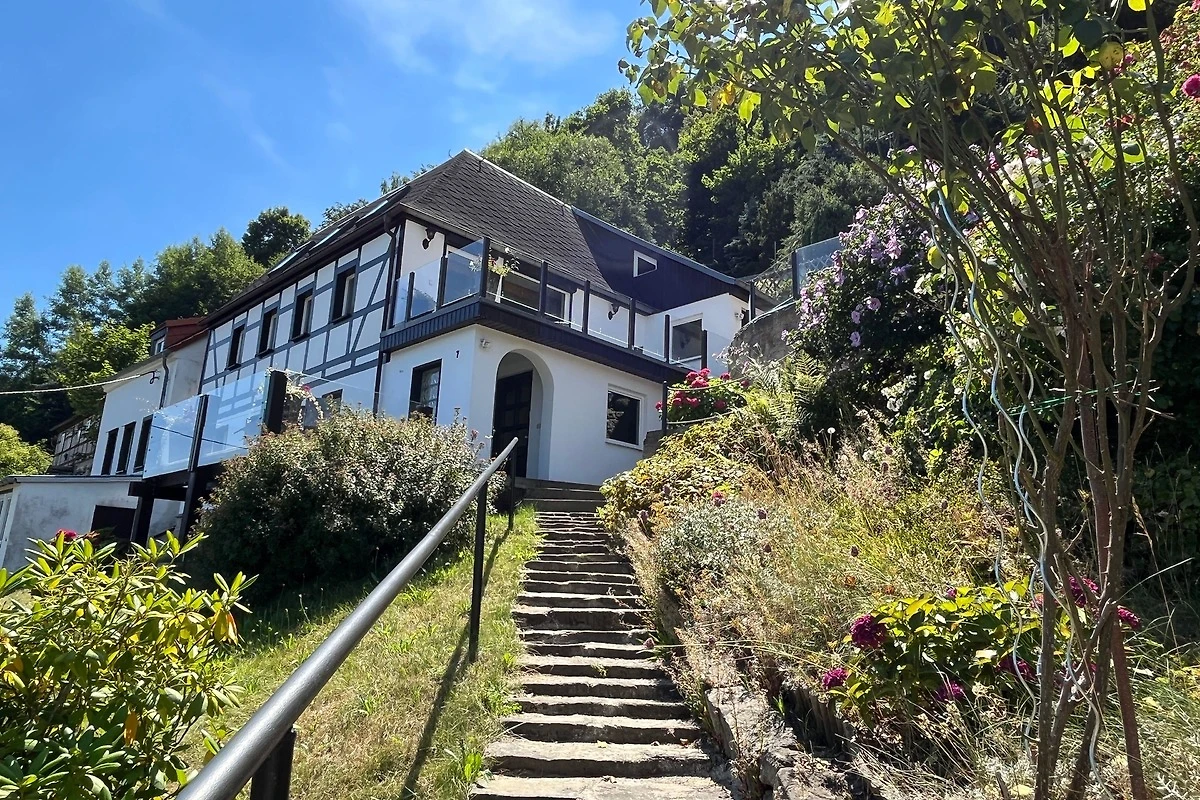Vor dem Haus lädt zusätzlich grosse Terrasse mit Blick über das Elbtal und Sitzecke Brennkorb und Grill zum Relaxen ein.Das Haus liegt am Elbhang und der Zugang erfolgt über einen