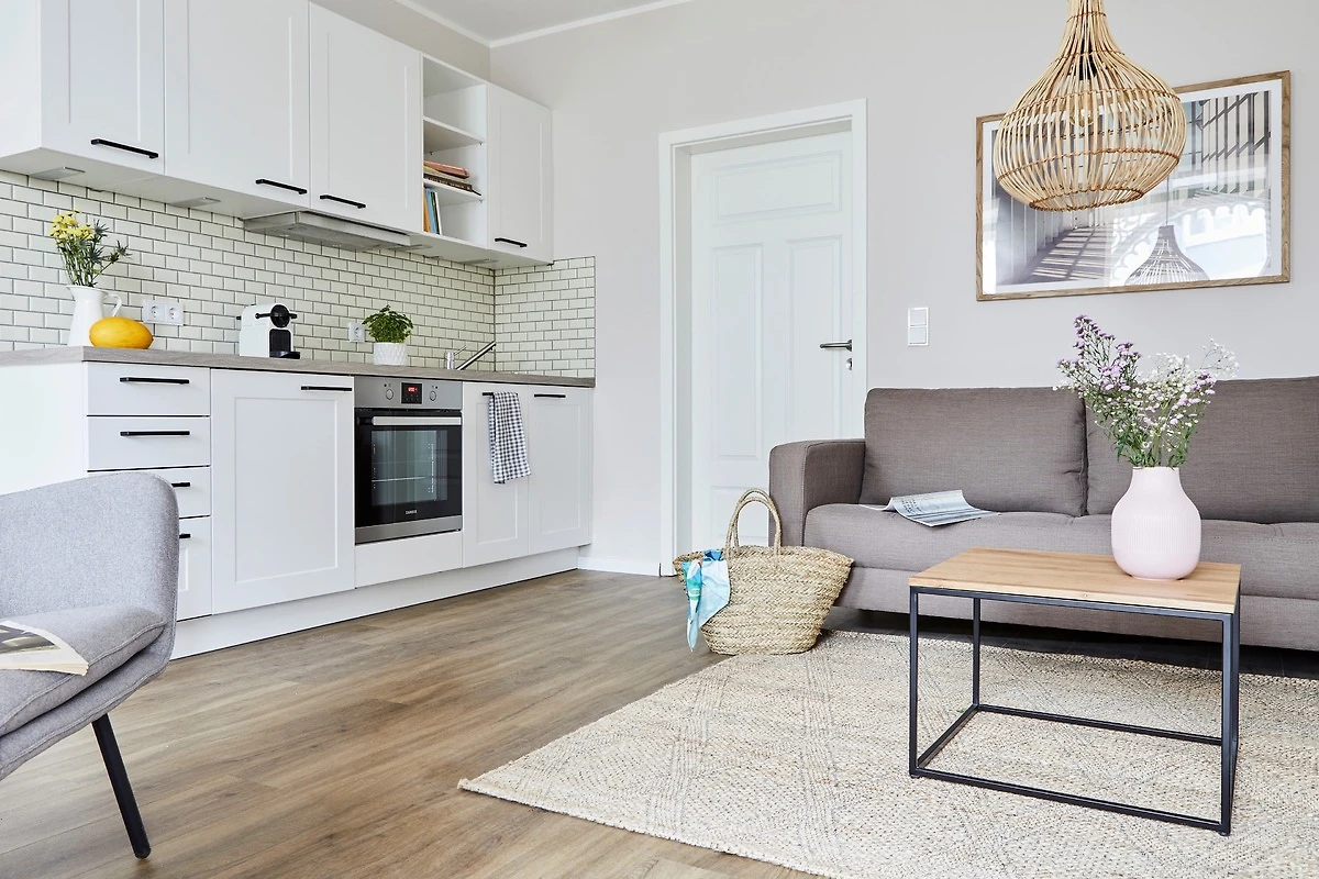 Die Wohnung befindet sich im Erdgeschoss des Anbaus und verfügt über eine eigenen Terrasse, die in Richtung Garten gelegen ist. Die Wohnung verfügt über einen grossen Wohnraum mit integrierter, moderner Küchenzeile, sowie einem separaten Schlafraum.