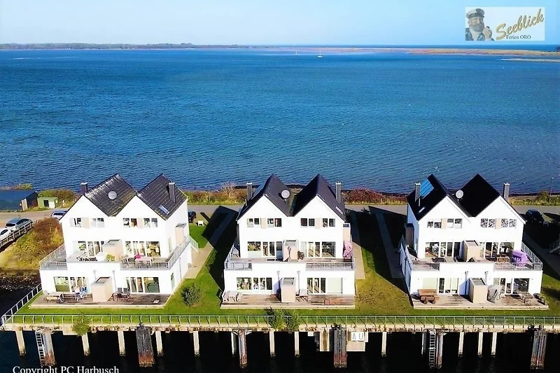 Ferienwohnung Kaptein`s Lounge by Seeblick Ferien ORO für 2-6 Personen auf zwei Ebenen im Obergeschoss + Dachgeschoss mit 180 Grad-Panorama-Blick sowohl auf den Hafen von Port Olpenitz im Süden und auf die Schlei mit den vielen vorbeifahrenden Segelschiffen, Maasholm und Schleimünde im Norden!
