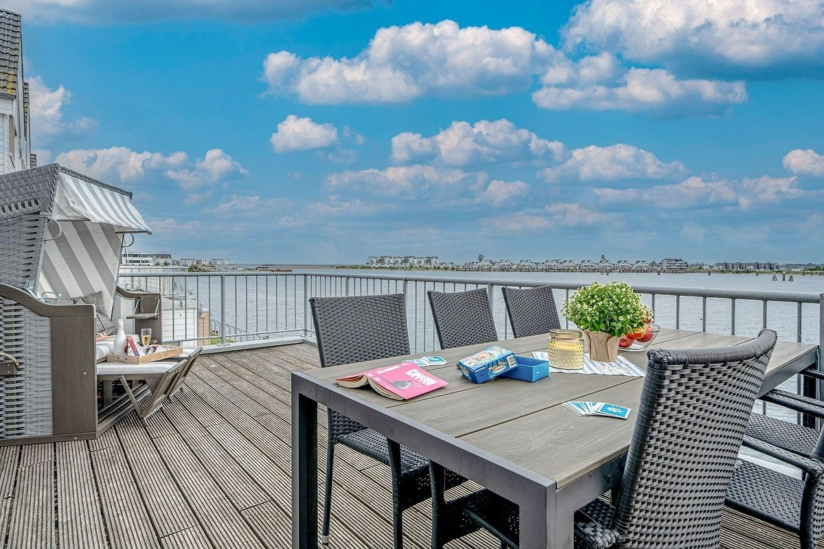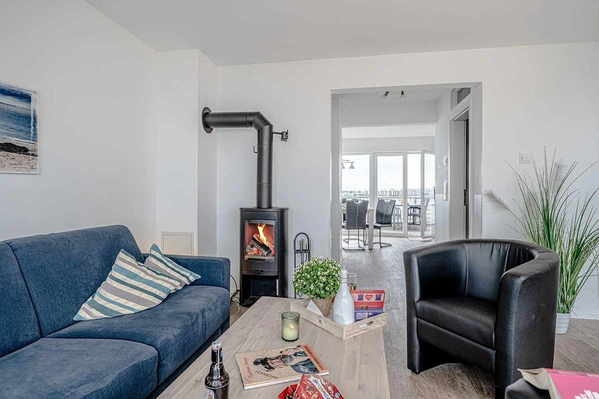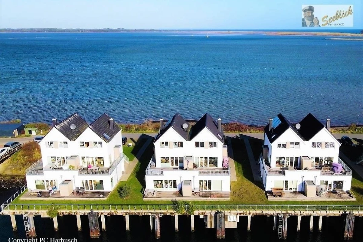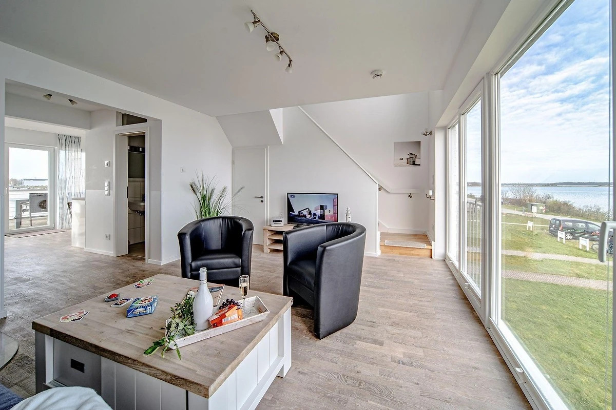 Der Blick dieser Maisonette-Wohnung auf zwei Ebenen im Ober- und Dachgeschoss des Hafenhauses am Kaianleger im OstseeResort Olpenitz mit 93 qm Wohnfläche ist wirklich unbeschreiblich! Durch die grossen Fensterflächen gelangt viel Licht in die Wohnung, so dass sie stets hell und einladend wirkt - und man fühlt sich hier fast mehr wie auf der "Kommandobrücke" eines (Kreuz-) Schiffs als in einer Ferienwohnung! Den Lebensmittelpunkt dieses loftartig gestalteten Feriendomizils bietet die Eingangsebene im 1. Obergeschoss, in dem die Räume fast fliessend ineinander übergehen. Das geräumige und einladende Wohnzimmer hat einen unbeschreiblichen Ausblick auf die Schlei und ist der ideale Treffpunkt für die ganze Familie, auch bei kühleren Jahreszeiten, wenn der eingebaute Kamin prasselt. Über den angrenzenden Essbereich mit offener Küche gelangt man zur grossen Terrasse in Südausrichtung und einem 180 Grad-Panoramablick über den ganzen Hafen. Abgerundet wird diese Etage mit einem Gäste-WC und Dusche. Über eine bequeme Treppe gelangen Sie vom Wohnbereich ins Dachgeschoss zu den zwei Schlafzimmern und dem grosszügigen Wellness-Bad mit Duche, grosser Badewanne mit Whirlpoolfunktionen und einer Infrarotsauna. Das Masterbedroom mit Blick in Richtung Marina verfügt zudem über einen TV. Hier bietet sich überall ein unvergleichbarer Ausblick auf Hafen und Schlei. Mehr Wasserblick als speziell in diesem aussergewöhnlichen Ferienobjekt können Sie fast nirgendwo sonst haben: Nach Norden vom Wohn- und Schlafzimmer aus auf Schlei und die vorbeifahrenden Segelschiffe, die Ostsee sowie den Leuchtturm von Schleimünde, und nach Süden von Essbereich und grosser Panorama-Terrasse aus auf das komplette Hafengebiet von Port Olpenitz!