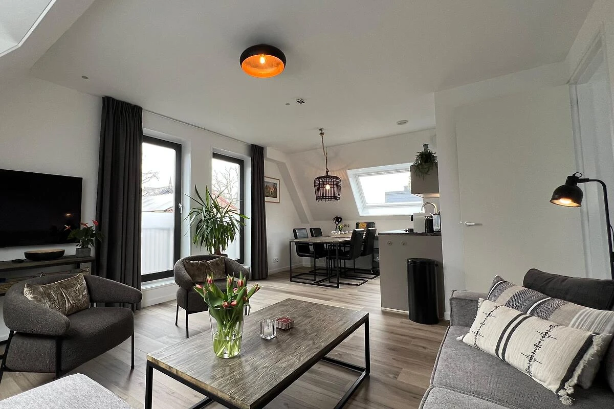 Die Ferienwohnung hat einen eigenen Zugang. Das helle und geräumige Wohnzimmer verfügt über eine gemütliche Sitzecke mit Smart-TV. Die offene und luxeriöse Küche ist gut und komplett ausgestattet (Filter- und Nespressomachine, Geschirrspüler, Backofen usw.)